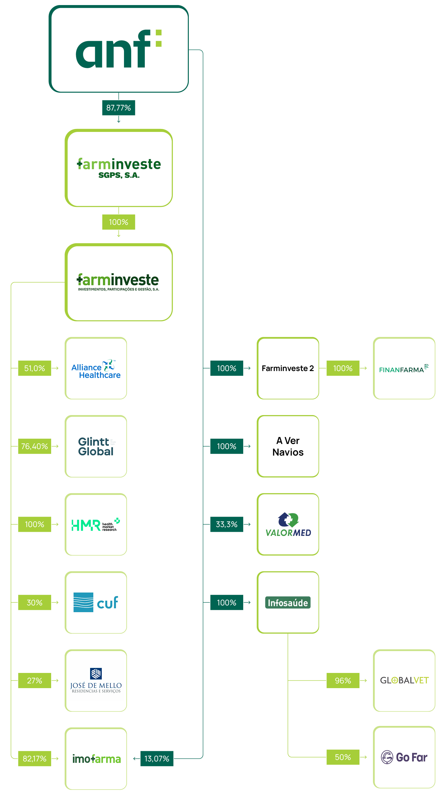 A Farminveste SGPS S.A. é a holding detentora das participações sociais da ANF, tendo como áreas de negócio a distribuição farmacêutica, a prestação de cuidados de saúde, o sistema de informação, a inteligência sobre o mercado farmacêutico, o desenvolvimento da atividade da farmácia e o imobiliário.