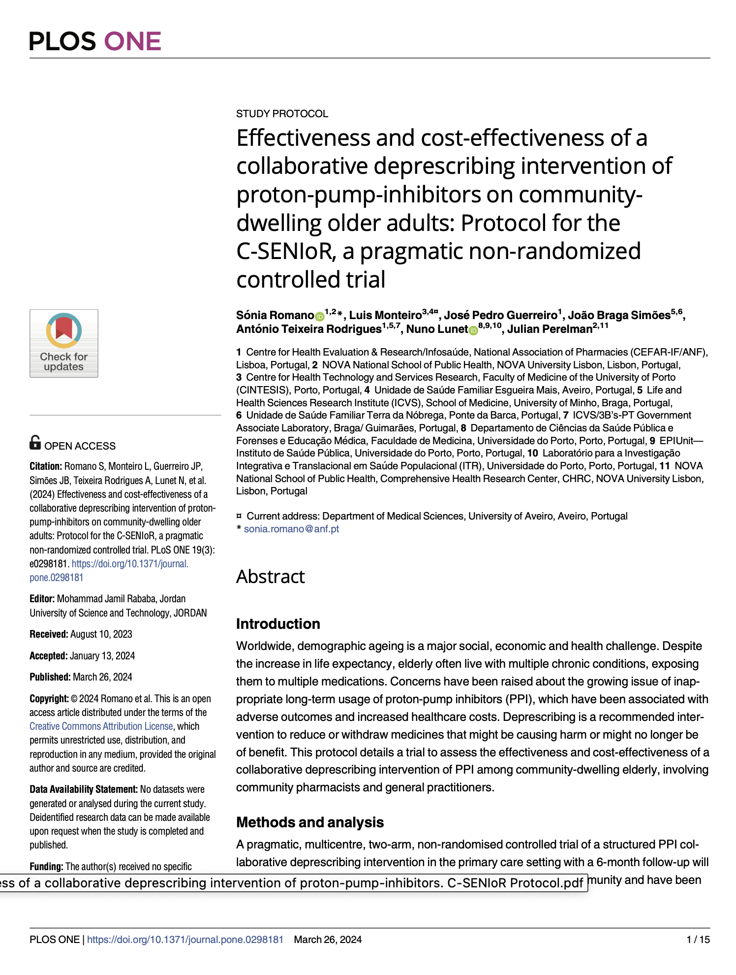 Effectiveness and cost-effectiveness of a collaborative deprescribing intervention of proton-pump-inhibitors on community-dwelling older adults: Protocol for the C-SENIoR, a pragmatic non-randomized controlled trial