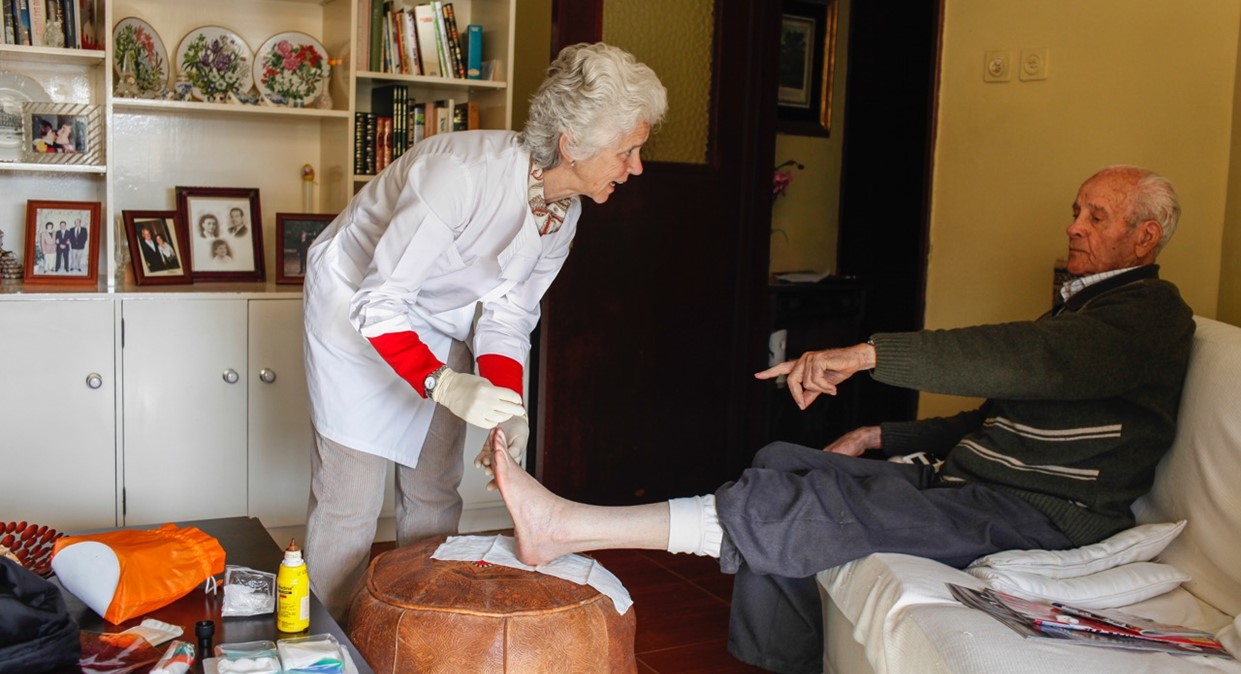 Nas situações mais graves, em que o utente tem um problema e não pode sair de casa, Maria João presta também serviços ao domicílio. António José, de 94 anos, é um desses casos. A enfermeira explica que, devido ao pé diabético, os tecidos do pé esquerdo estavam em risco de gangrenar. Um problema que, na maioria das vezes, resulta em amputação.