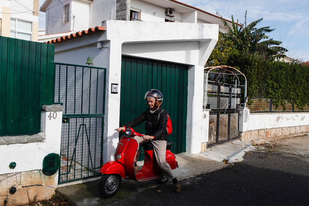 Em dia de curativo, o motor da Vespa clássica ouve-se ao longe. A campainha toca: «É a Maria João». A meio da introdução o portão já está aberto. O penso é feito no sofá da sala, como é hábito. «Ainda tem muita força na perna», brinca a enfermeira enquanto lhe descalça a meia. «Eu sou rijo, comi muita bolota», responde António. Traz o Alentejo na pronúncia cerrada e na boina que nunca tira. Entre histórias de Ourique e da guerra, fala das saudades dessa casa de outros tempos, que só visita uma vez por ano. O curativo acaba e o pé está cada vez melhor. «Não se esqueça de caminhar um bocadinho todos os dias», lembra Maria João. António não esquece. Só fica em casa quando está a chover.