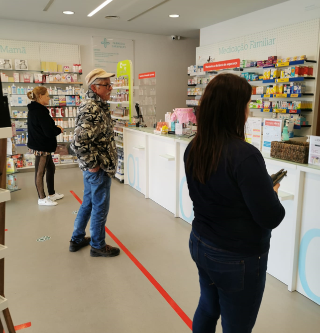 No interior da farmácia permanecem apenas três utentes de cada vez – um por balcão, respeitando sempre a marca de segurança no chão, à distância de um metro. O acrílico protege, permitindo manter a proximidade a que a equipa habituou os utentes.