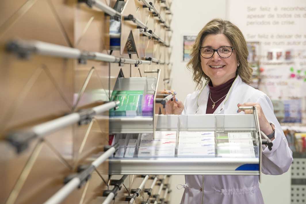 Jesuína Leite chega à farmácia bem-disposta numa tarde de terça-feira. Veio levantar uma nova receita do medicamento da mãe, de 77 anos. O manipulado foi prescrito pelo cardiologista, quando os níveis de potássio da dona Zélia revelaram estar abaixo do normal. Sem alternativa comercial, foi na farmácia da freguesia de Amorim, onde vive, que encontrou solução para o problema.