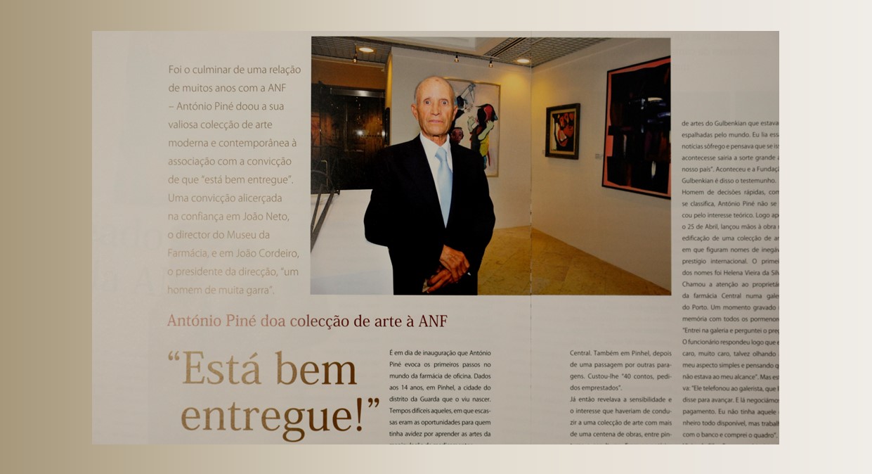 Nessa reunião, que mantenho em memória, pediu-me que aceitasse, em nome da ANF, a doação da sua coleção de arte. E as razões eram claras: foi na ANF que viveu feliz a servir as farmácias, sentia que a ANF era a sua casa, a sua Família, e era a ANF a única entidade em quem tinha confiança para preservar e valorizar a sua coleção de arte.