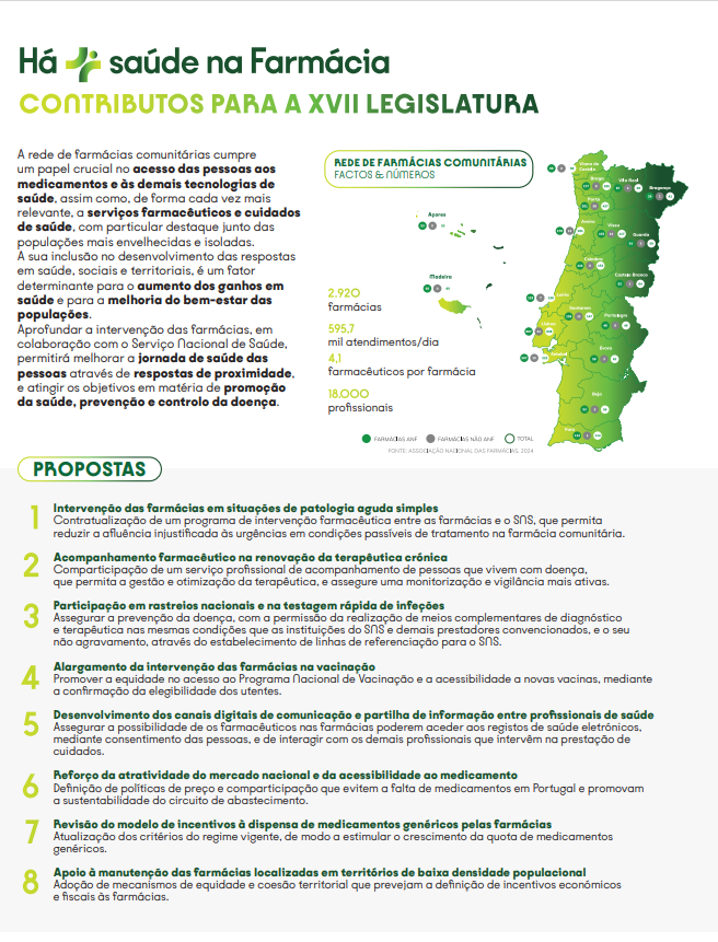 A ANF definiu um conjunto de contributos para a XVII Legislatura, que visam contribuir para o reforço do papel das farmácias na transformação da jornada de saúde das pessoas, assim como para a sustentabilidade do sistema de saúde e das farmácias.