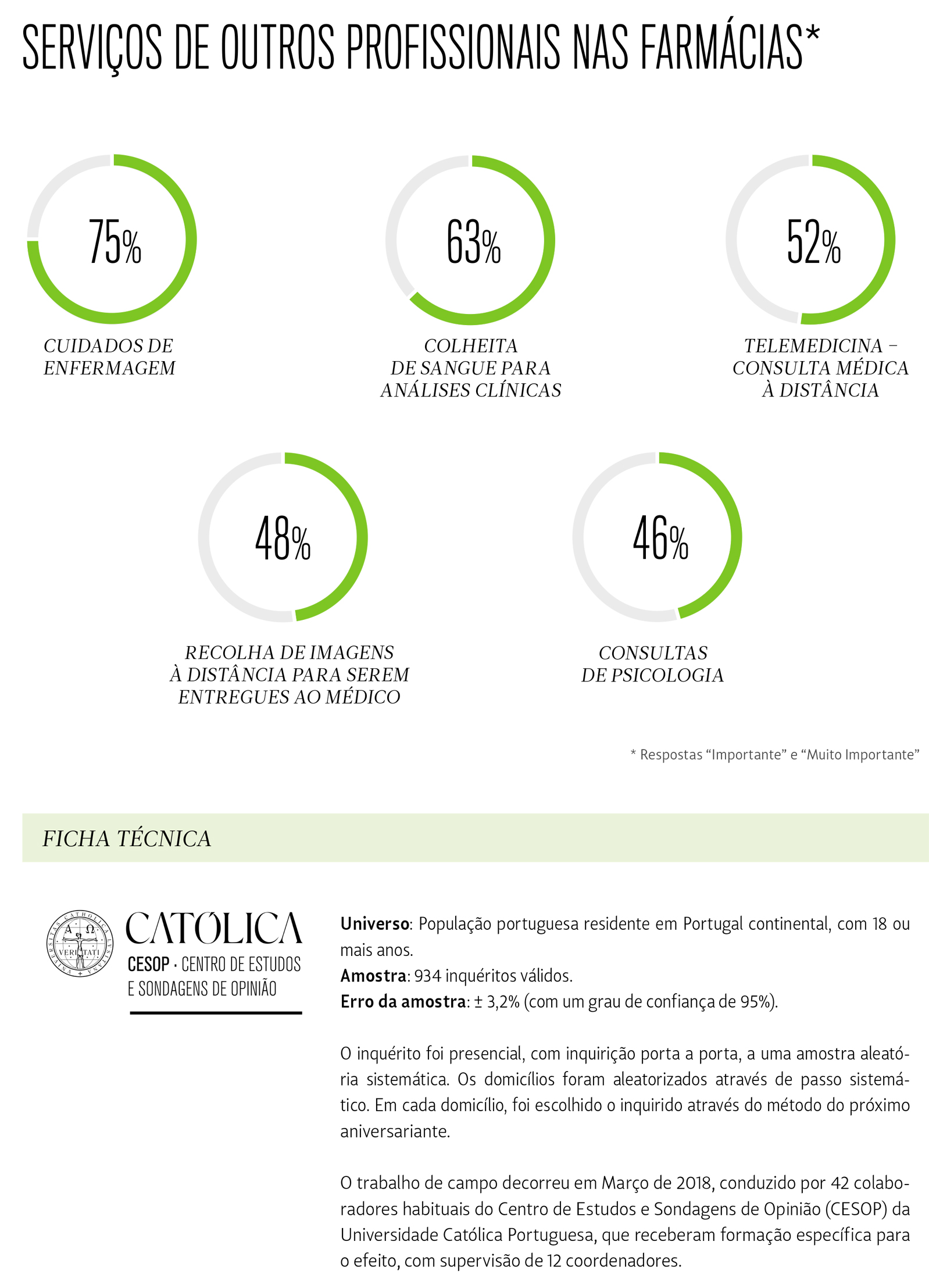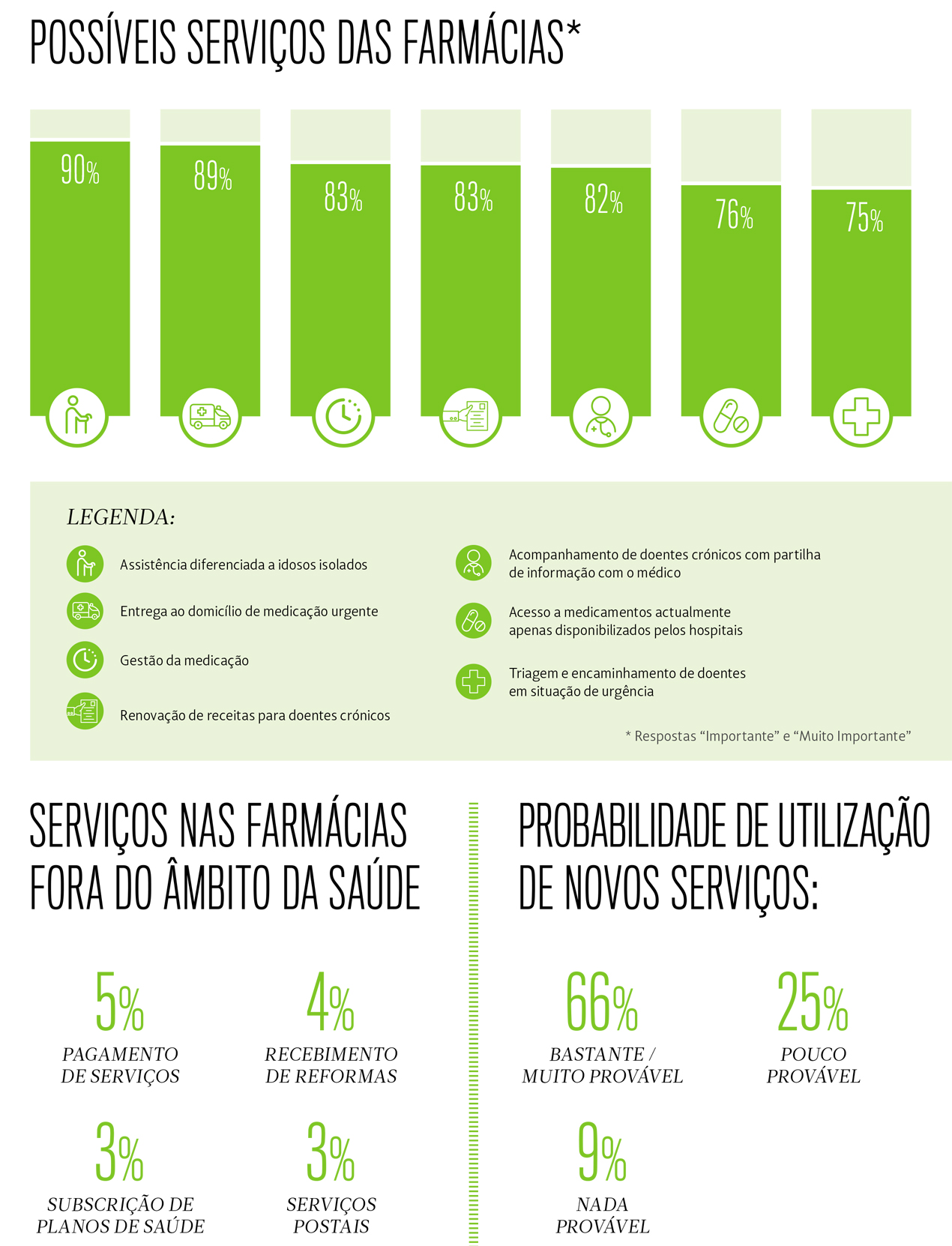 Uma larga maioria de inquiridos considera Importantes ou Muito Importantes todos os serviços de saúde referidos no questionário presencial da Universidade Católica Portuguesa. A assistência diferenciada a idosos isolados reúne o interesse de 90% dos inquiridos. Quanto aos doentes crónicos, os portugueses desejam que as farmácias procedam ao seu acompanhamento, com partilha de informação com os médicos (82%) e que possam renovar-lhes as receitas (83%).
