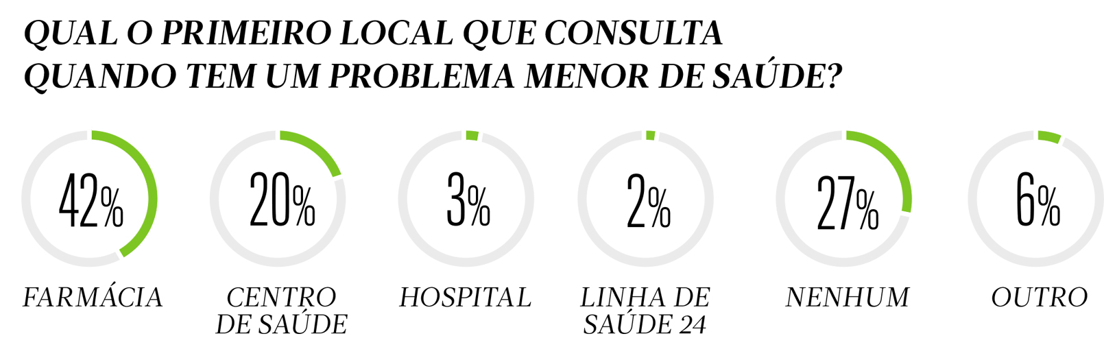 A farmácia é o serviço mais procurado pelos portugueses quando surge um problema menor de saúde. Nessas circunstâncias, a farmácia é ainda mais procurada pêlos jovens entre os 18 e 24 anos (47%), adultos dos 35 aos 44 anos (48%), assim como pelos portugueses de rendimentos mais baixos (44%).