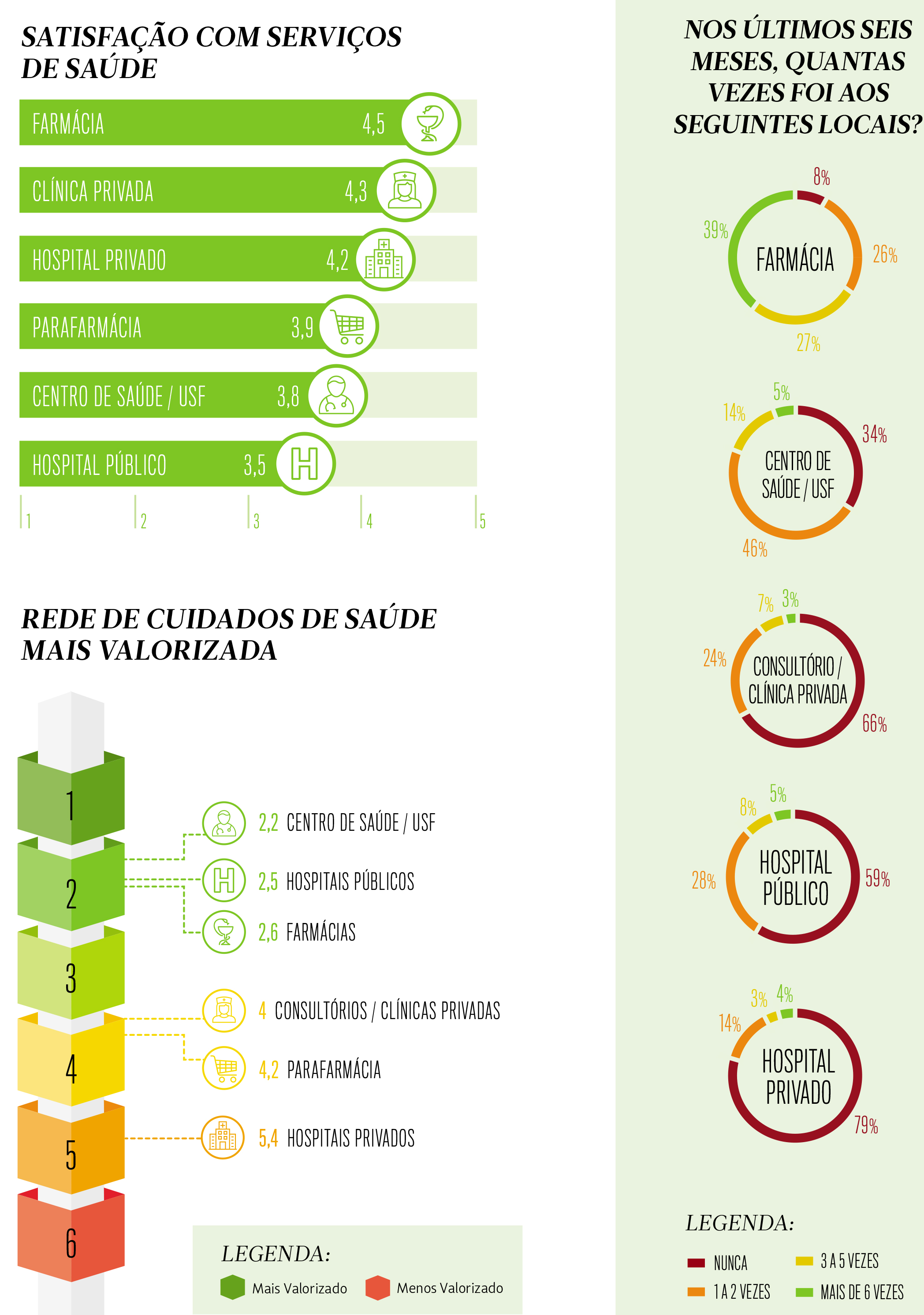 As farmácias são o serviço de saúde mais frequentado pela população: 39% dos inquiridos foram seis ou mais vezes a uma farmácia nos últimos seis meses, frequência que sobe significativamente na população acima dos 65 anos (49%) e na região do Alentejo (53%).
