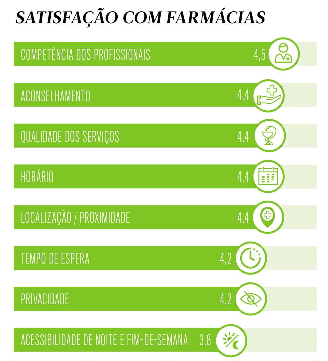Numa escala de um a cinco valores, as farmácias recolhem uma avaliação média superior a quatro na generalidade dos parâmetros objecto deste inquérito. Destaque para Competência dos Profissionais (4,5 valores), Aconselhamento, Qualidade dos Serviços, Horário e Localização/ Proximidade (todos com 4,4 valores).
