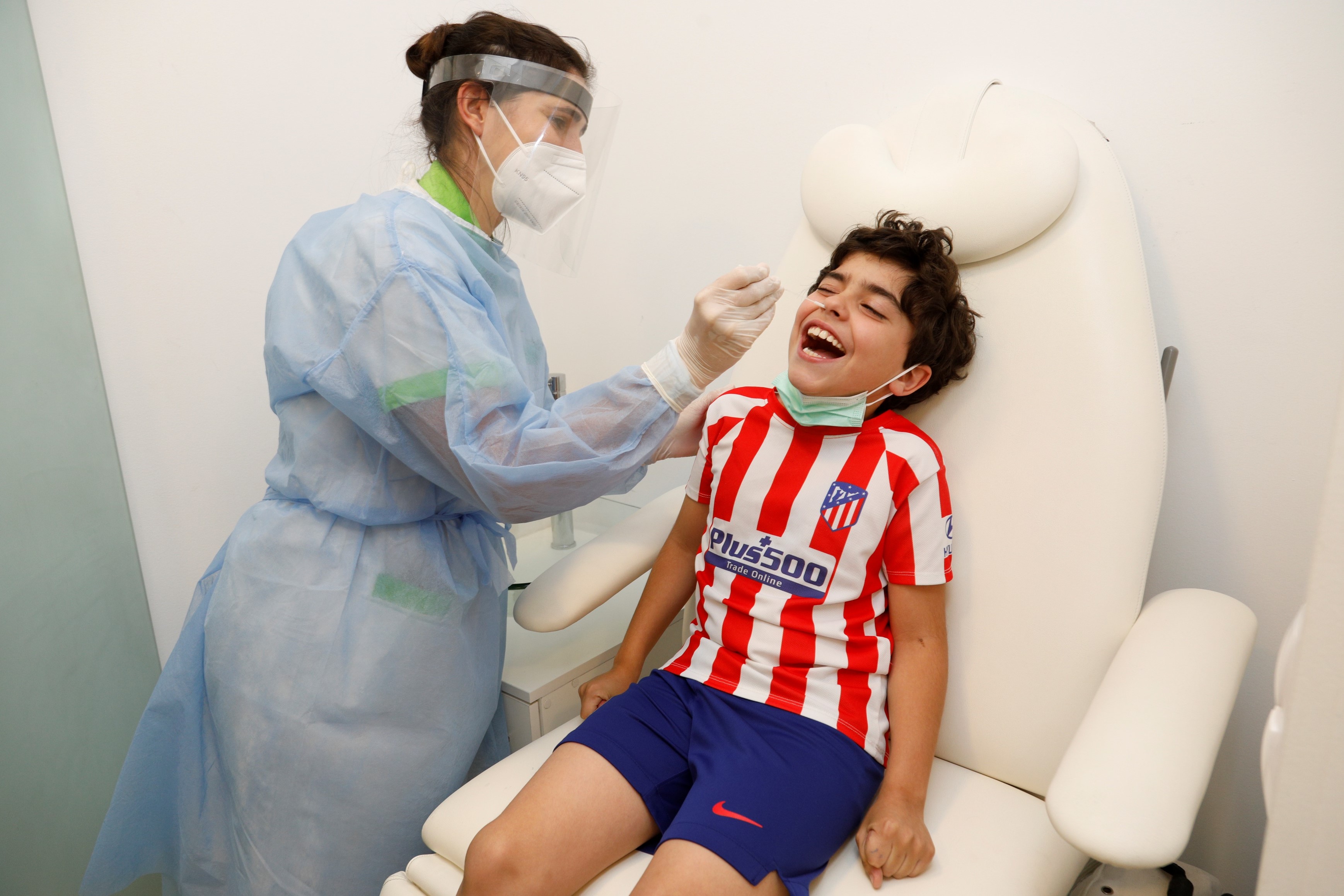 Matias, 8 anos, faz o seu teste na Farmácia Branco, de Algés