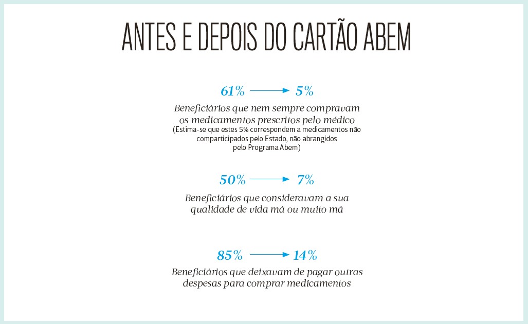 Em termos de repercussão na vida dos beneficiários, o Programa Abem impactou a percentagem daqueles que nem sempre conseguiam comprar os medicamentos prescritos, fazendo-a cair de 61% para 5%. De igual modo, com o Abem, a percentagem de beneficiários que deixavam de pagar outras despesas para comprar a medicação indispensável ao controlo das suas doenças diminuiu de 85% para 14%. Para mais de metade dos beneficiários, o fator a que atribuem maior relevância no Abem é o acesso anónimo e digno aos medicamentos.