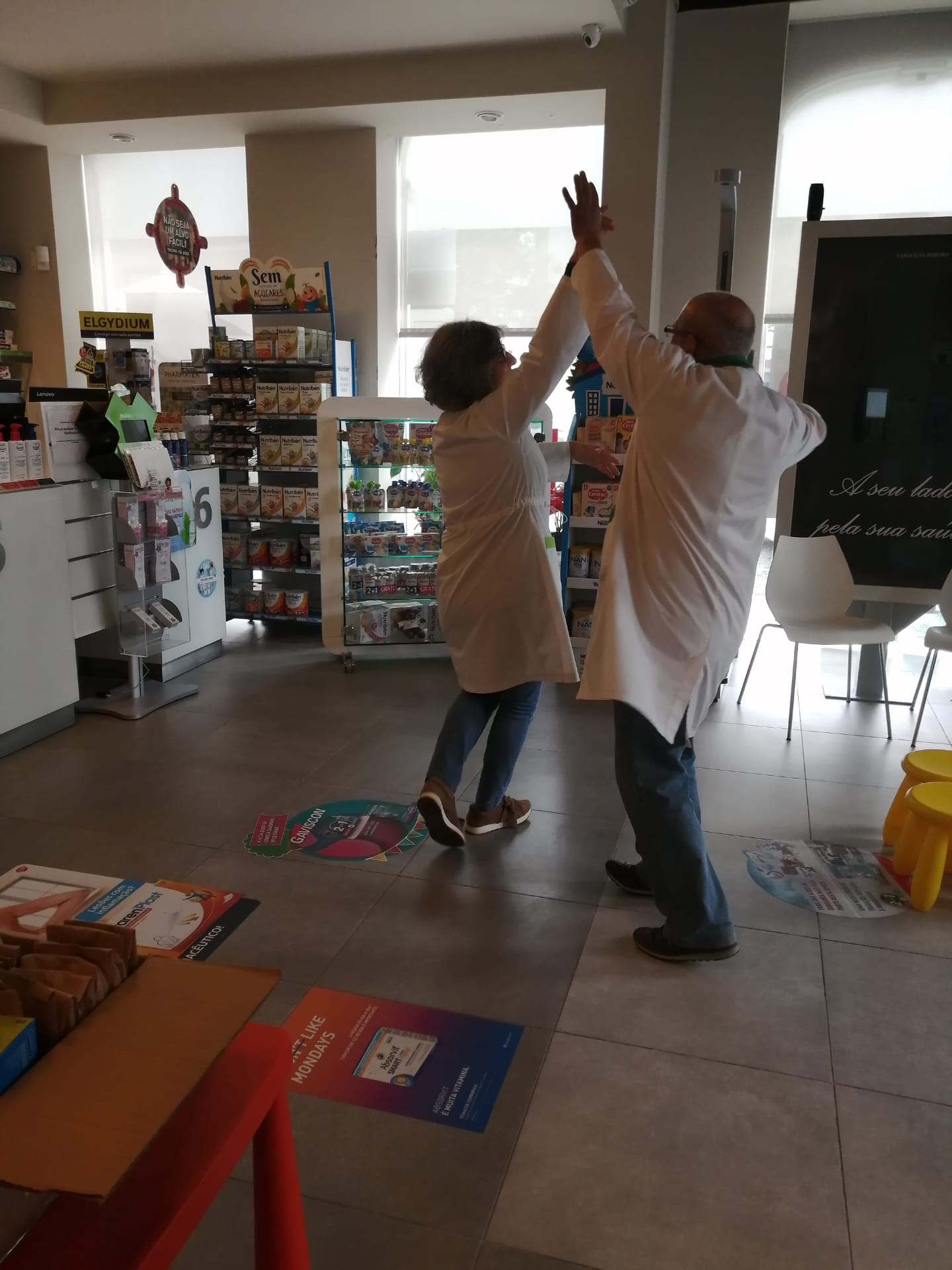 A trabalhar o dia inteiro, em turnos que não se cruzam, a equipa continua a adaptar-se à nova normalidade. Embora incertos em relação ao futuro, os 14 elementos da Farmácia Ribeiro mantêm a boa disposição e a esperança em dias melhores. E isso, garante Andreia, contagia os utentes. «No 25 de Abril celebrámos a dançar uma modinha» - conta a directora-técnica de 36 anos - «não podíamos sair à rua, mas pelo menos festejámos juntos».