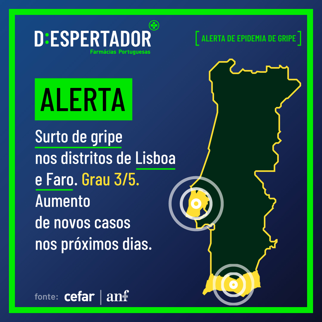 Está um surto de gripe activo no país e os distritos mais afectados são Lisboa e Faro. O Centro de Estudos e Avaliação em Saúde (CEFAR), da Associação Nacional das Farmácias, prevê que o número de novos casos vai aumentar na última semana do ano, com a actividade gripal a subir para grau 3 (numa escala de 1 a 5) em dez concelhos de Lisboa e 11 de Faro. O mesmo vai acontecer nos concelhos de Matosinhos e Odemira.