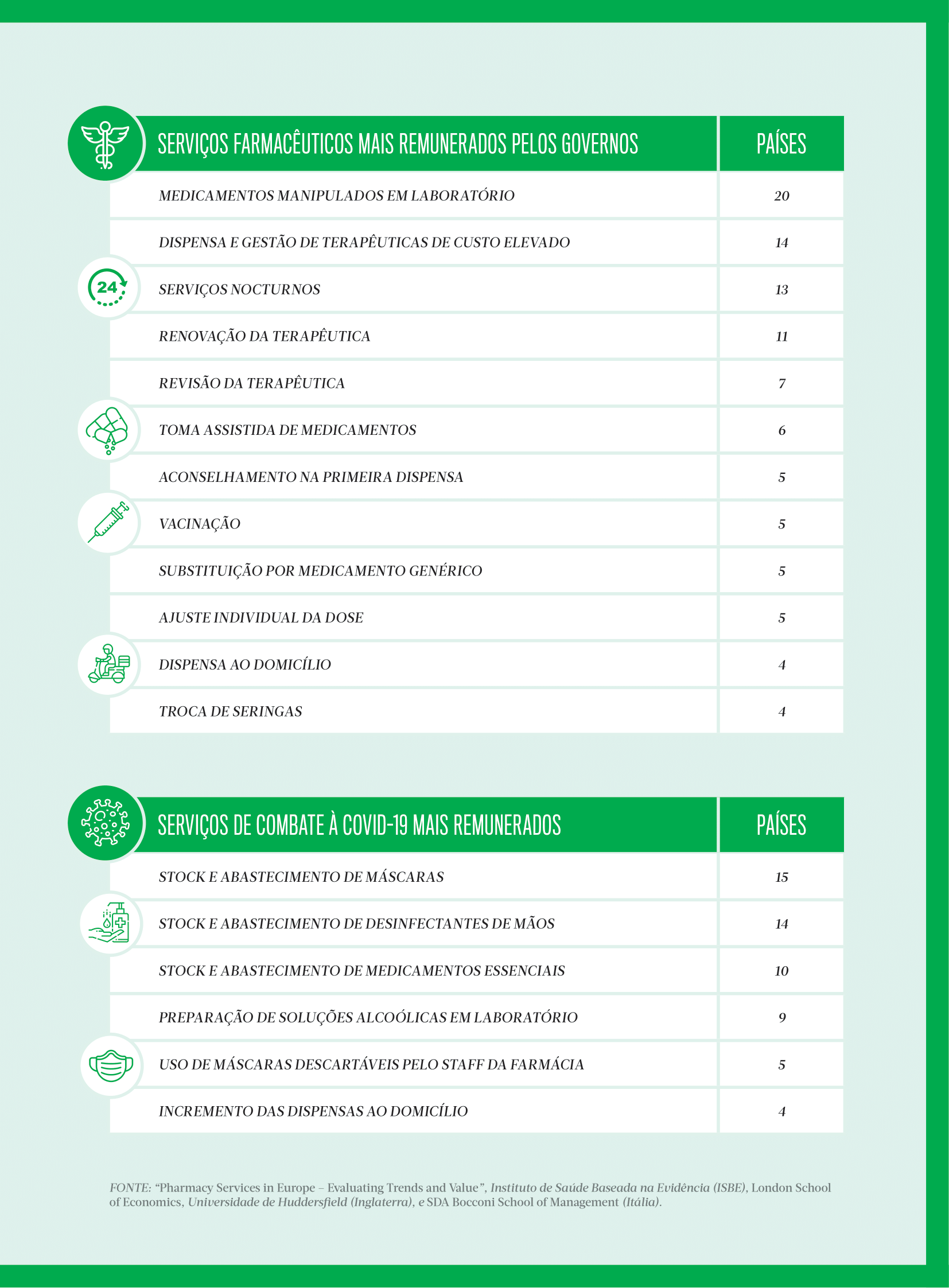 O mapeamento contabilizou 38 serviços farmacêuticos que já eram praticados antes da pandemia, 31 dos quais comparticipados por um número variável de Estados. As farmácias exercem funções «muito além da dispensa de medicamentos, já reembolsadas em alguns países, o que confirma o seu papel na promoção da saúde, rastreio, combate à doença e acompanhamento de casos», descreve o relatório final do estudo. As prioridades dos Estados, nas decisões de investimento, recaem em serviços promotores de eficiência económica, segurança e adesão à terapêutica.
