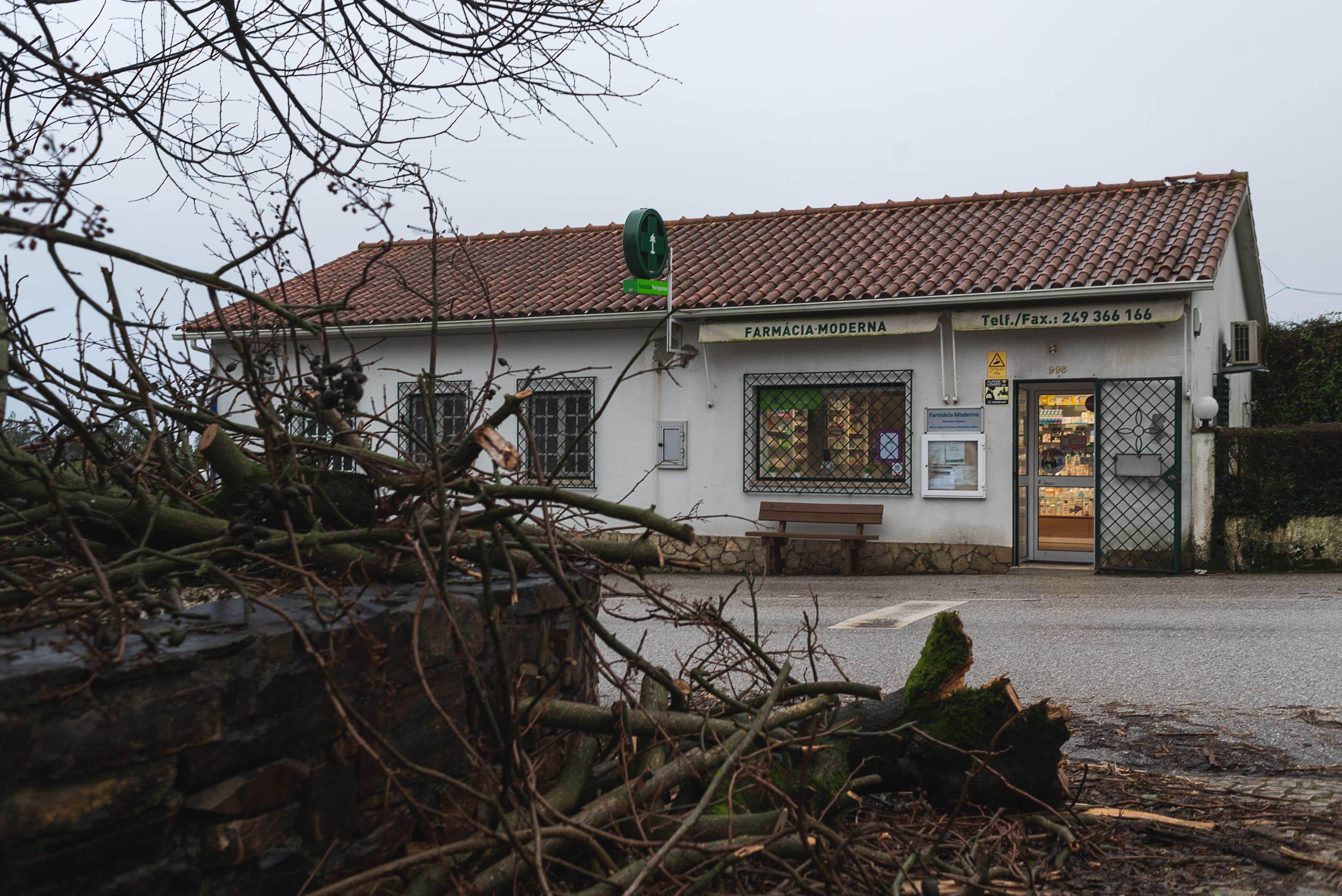 À porta da Farmácia Moderna, em Ferreira do Zêzere, uma das zonas mais fustigadas pela depressão Kristin, o cenário é de devastação: árvores derrubadas, postes de eletricidade caídos, destroços empilhados nos quintais. Lá dentro, o sorriso da equipa mantém-se.