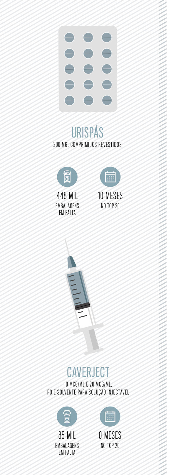 Um dos medicamentos que mais esteve em falta em 2017 foi o Urispás de 15 comprimidos, indicado no tratamento de sintomas que acompanham problemas da bexiga e da próstata, como dor, disúria e urgência miccional. Embora exista uma embalagem de 60 comprimidos, não há qualquer genérico.