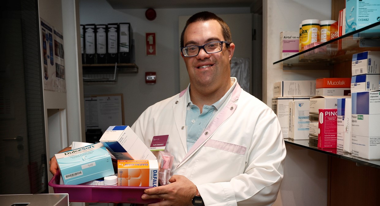Apesar de ter nascido com trissomia 21, a deficiência não é obstáculo na vida de Filipe. A trabalhar desde os 17 anos na Farmácia Luciano & Matos, o jovem é um elemento fundamental da equipa. Quem o garante é Helena Amado, directora-técnica desta casa em plena baixa coimbrense, vizinha da Igreja de Santa Cruz. Por ali todos o conhecem. A Nelson Silva, proprietário do Café vizinho “A Petisca”, sobram-lhe elogios: «É uma pessoa espectacular. A gente vê pessoas com mais saúde e não têm as capacidades que ele tem».
