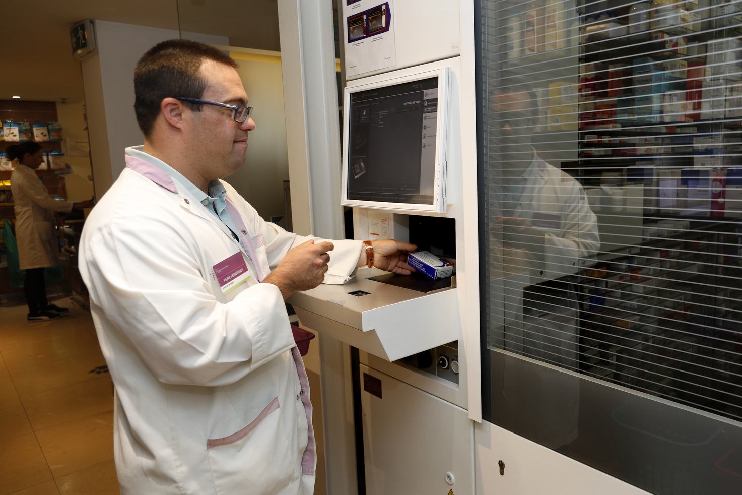 Para facilitar a vida a quem está ao balcão, há três anos foi instalado um robô na farmácia. Filipe ficou deprimido com a chegada daquela máquina que aparentemente iria substituí-lo. «Na imaginação dele, pensava que era um boneco que vinha fazer o seu trabalho». Helena tranquilizou-o, dizendo-lhe: «Tu serás o responsável pelo robô». É ele que parametriza manualmente o robô, quando este não reconhece a embalagem, de forma a poder armazená-la. Para além disso, supervisiona os prazos de validade. Decide quais as embalagens a entregar aos cuidados do robô e quais devem antes ser colocadas nas caixas cor-de-rosa velho com a inscrição “reposição de stock – validade curta”.