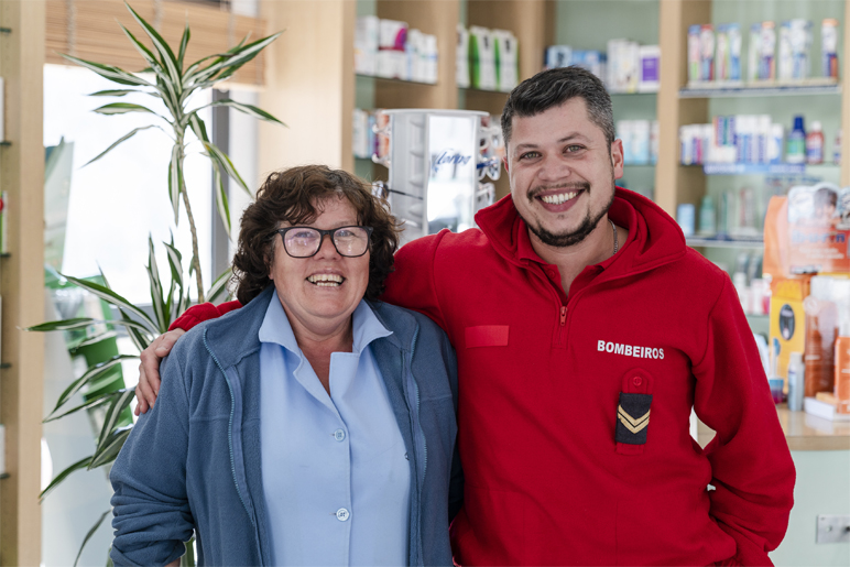 Maria Lucinda de Sousa, de 57 anos, vive no Curral das Freiras há 26. «Venho sempre cá», atira. Já conhece os farmacêuticos e gosta da forma como é tratada. «Ainda há um pedacinho saí daqui com um saco de medicamentos para o meu marido». «Isto é quase uma família!», interrompe o filho, Jonas Abreu, de 34 anos. Bombeiro profissional há 17 anos, desde há três anos que frequenta a farmácia mais do que nunca: «Venho cá levantar os leites e os soros para o meu filho». Um dos técnicos é também o amigo de infância com quem jogava à bola. «O povo do Curral é muito humilde», conta, e «as pessoas aqui dão muito valor aos bombeiros, à farmácia e ao centro de saúde, porque são serviços que fazem falta». Recorda também que há muita gente sem transporte ou com dificuldades de mobilidade, que não consegue deslocar- se até ao Funchal. «Aqui toda a gente se conhece. Olhe, esta senhora é a dona Maria. Foi contínua na minha escola primária.», afirma, enquanto abraça uma utente que acaba de entrar.