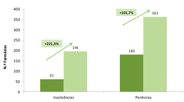 São já 19.1% as farmácias do país (549) em situação de insolvência ou de penhora, um crescimento de 132% entre Dezembro de 2012 e Julho de 2016. Neste período, o número de insolvências subiu de 61 para 196 Farmácias (+221.3%). Já o número farmácias sob penhora mais que duplicou, de 180 para 363 (+101.7%).