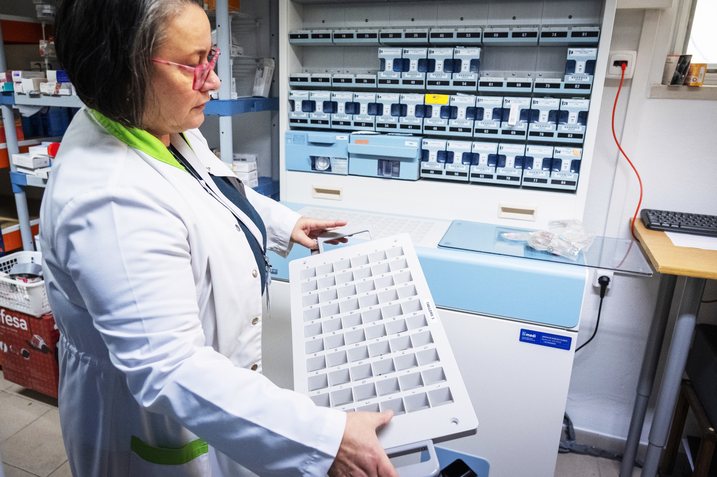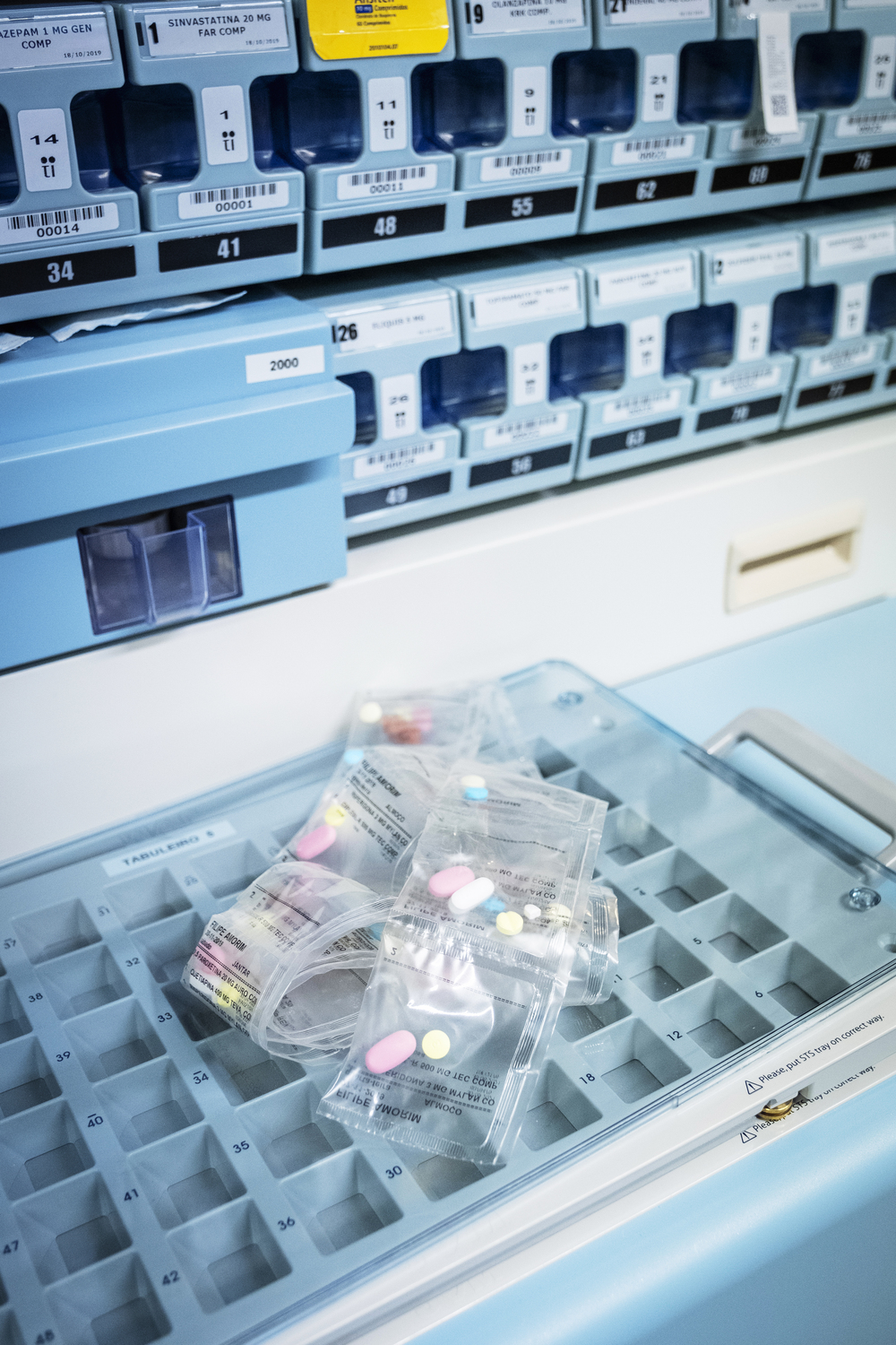 Agora, todas as quintas-feiras, na cave da farmácia, Helena Pires prepara medicamentos para 60 utentes aderentes ao programa PIM, a maioria deles idosos polimedicados, com a ajuda de um software espanhol e de uma máquina coreana. O programa informático analisa as receitas dos utentes e comanda um dispensador que divide os medicamentos em saquetas, inseridas em fitas semanais, quinzenais ou mensais. O profissional de saúde insere a terapêutica na máquina e o aparelho passa à divisão, de acordo com as indicações do software. As saquetas incluem a medicação necessária para cada dia.
