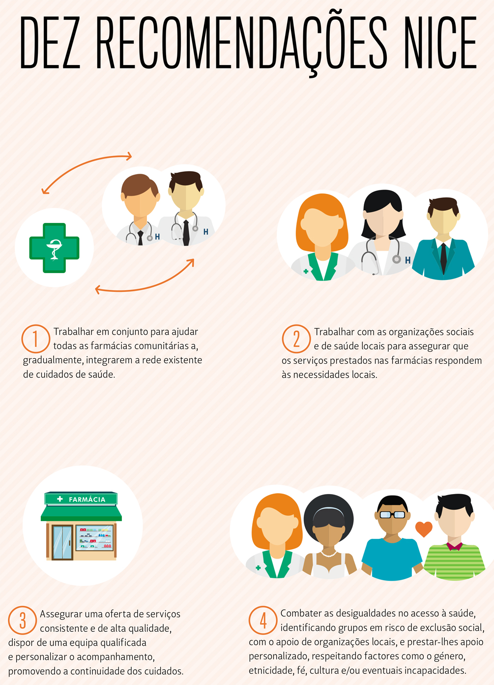 O NICE recomenda às farmácias o desenvolvimento de serviços standard, «para que as pessoas saibam o que podem encontrar em toda a rede». É ainda importante que informem o público de forma consistente, acerca dos serviços que disponibilizam e quanto às qualificações e especializações das respectivas equipas.