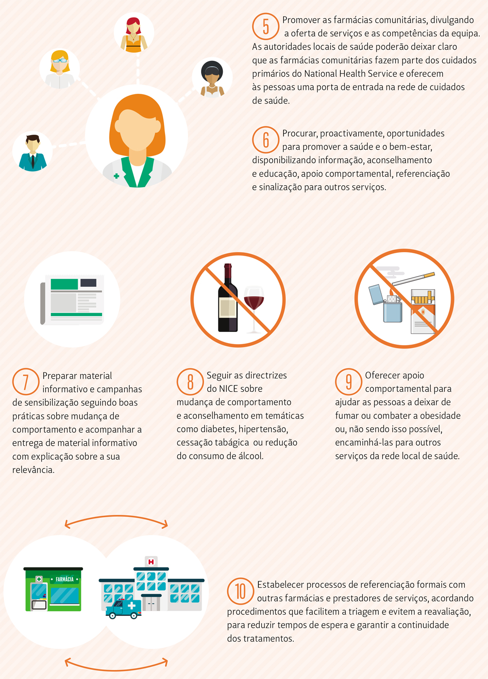 Os dados recolhidos pelo NICE mostram que as farmácias prestam, com resultados positivos, aconselhamento sobre saúde e bem-estar aos doentes crónicos e a cidadãos interessados em adoptar estilos de vida mais saudável. O texto da guideline aponta como exemplos o aconselhamento sobre diabetes e hipertensão. Refere também a eficácia do aconselhamento farmacêutico na cessação tabágica, redução do consumo de álcool e melhor controlo do peso corporal.