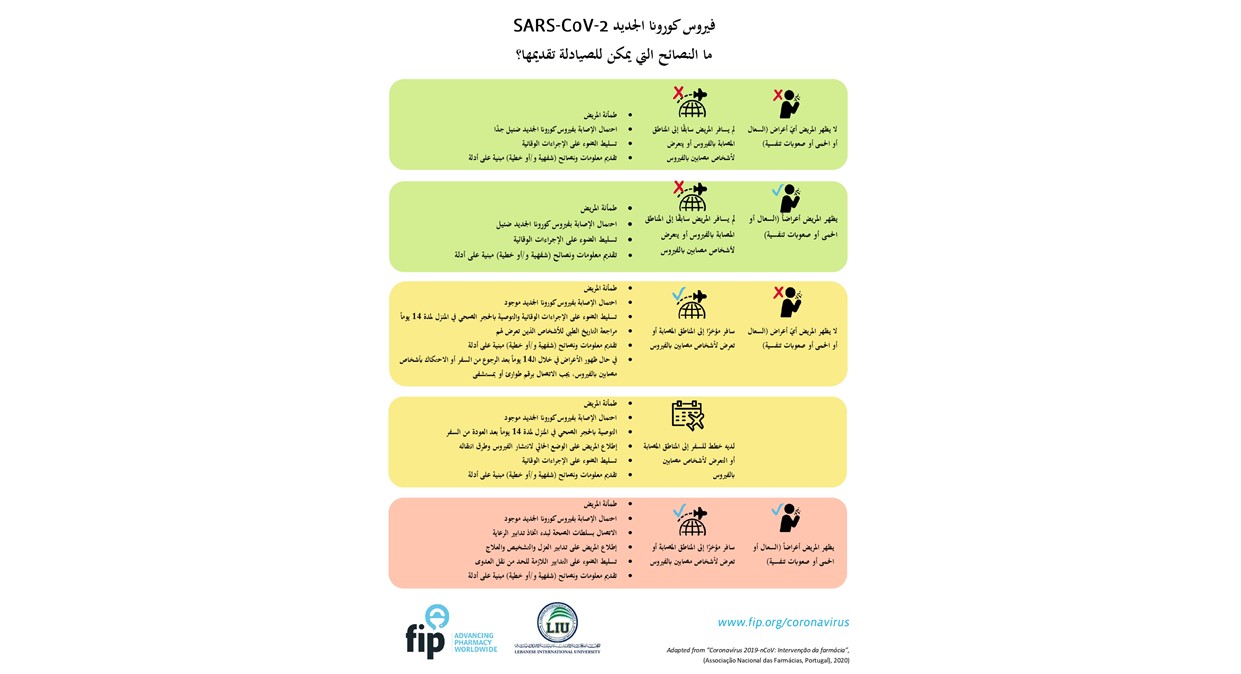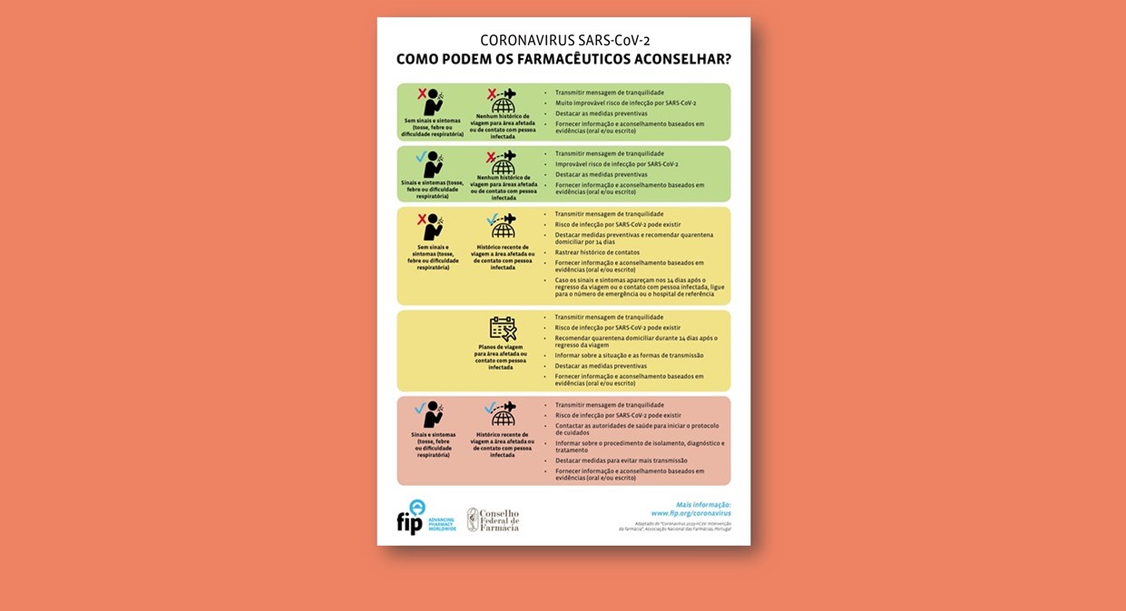 A instrução sanitária que publicamos nestas páginas foi elaborada pelo CEDIME - Centro de Informação do Medicamento e Intervenções em Saúde da Associação Nacional das Farmácias (ANF). No início de Março, a FIP recomendou a sua utilização aos farmacêuticos e suas equipas, em exercício em farmácias comunitárias, hospitalares e laboratórios de análises clínicas de todo o mundo. O guião português foi traduzido em dezenas de idiomas, como chinês, árabe, russo, inglês e espanhol.
