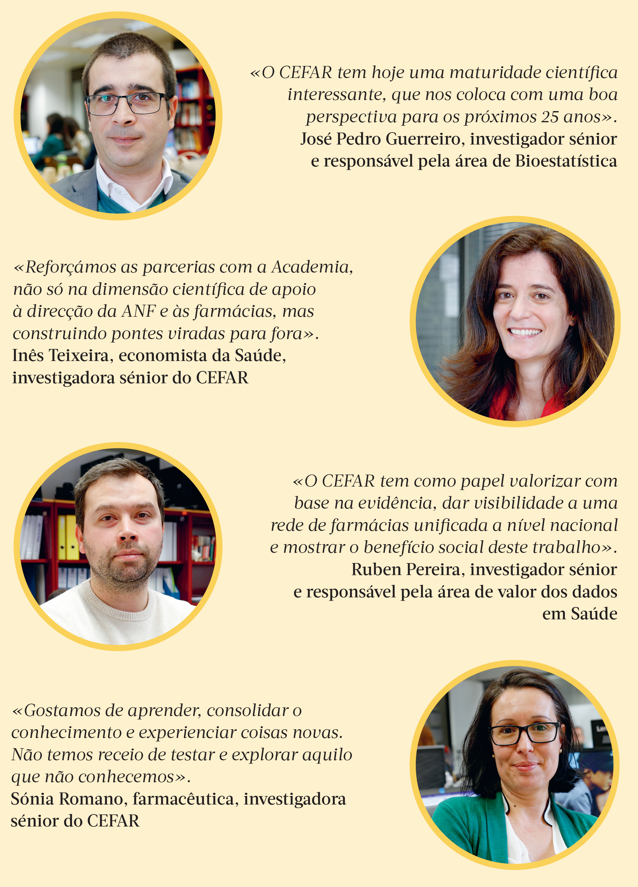 «Estamos a conseguir ter mais inovação e entrar noutras áreas», confirma Sónia Romano, farmacêutica e investigadora sénior, responsável pela área de Farmácia e Saúde Pública. Na sua opinião, «o CEFAR modernizou-se, reforçou a abertura ao exterior e é cada vez mais reconhecido ». Hoje conta com uma equipa madura e ambiciosa. «Essa ambição vai fazer-nos crescer sustentadamente, explorando a inovação, as parcerias e as farmácias, a razão da nossa existência», diz José Pedro Guerreiro, Tem 17 anos de casa, é responsável pela área de Bioestatística. Numa só frase usou as três palavras que melhor resumem a identidade do CEFAR hoje: inovação, parcerias, farmácias.