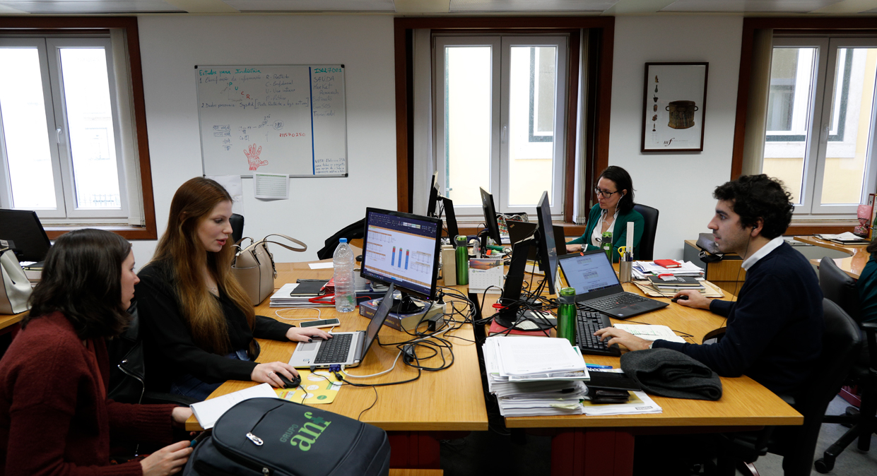 Na sala ampla, organizada em ilhas, trabalham os 18 elementos do CEFAR: farmacêuticos, economistas, matemáticos, doutorados em Epidemiologia da Saúde, inteligência artificial ou machine learning. Alguns acumulam anos de experiência, na “casa” ou na academia, outros vieram de diferentes centros de investigação ou acabaram de sair das faculdades.