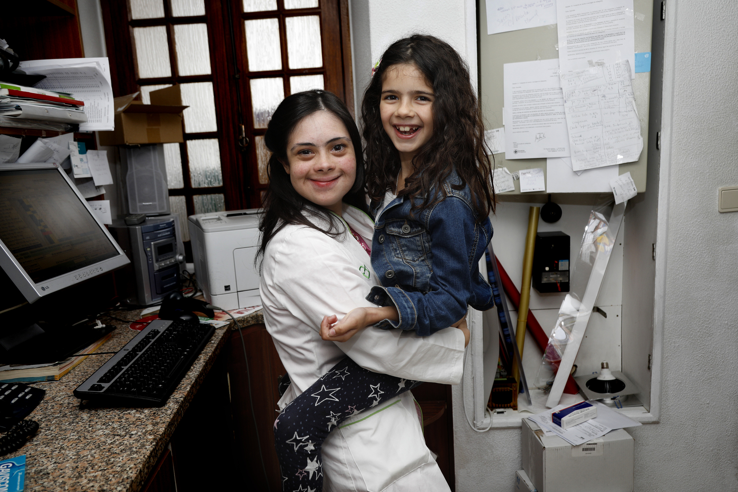 Maria Beatriz chega a passar facturas. Só no que toca a dinheiro pede auxílio. É ainda uma formadora qualificada nas tarefas que domina. Enquanto arruma os medicamentos, ensina a irmã mais nova, Ana Pilar, de oito anos. «Qual é a primeira letra?», questiona. «É a letra “A”. Onde está o “A”? Está aqui!», explica-lhe, com cuidado e entusiasmo.