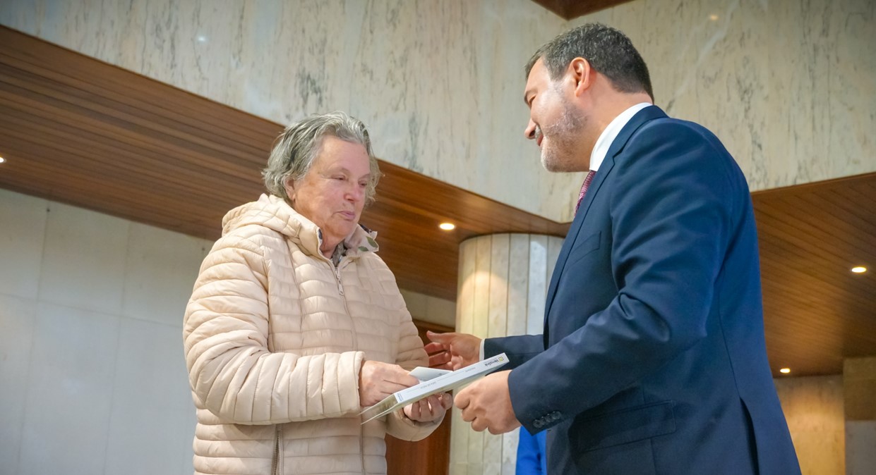Maria de Lourdes Lima, a primeira beneficiária do programa de PIM em São João da Madeira, recebe o cartão que lhe dá acesso gratuito ao serviço das mãos do presidente do município