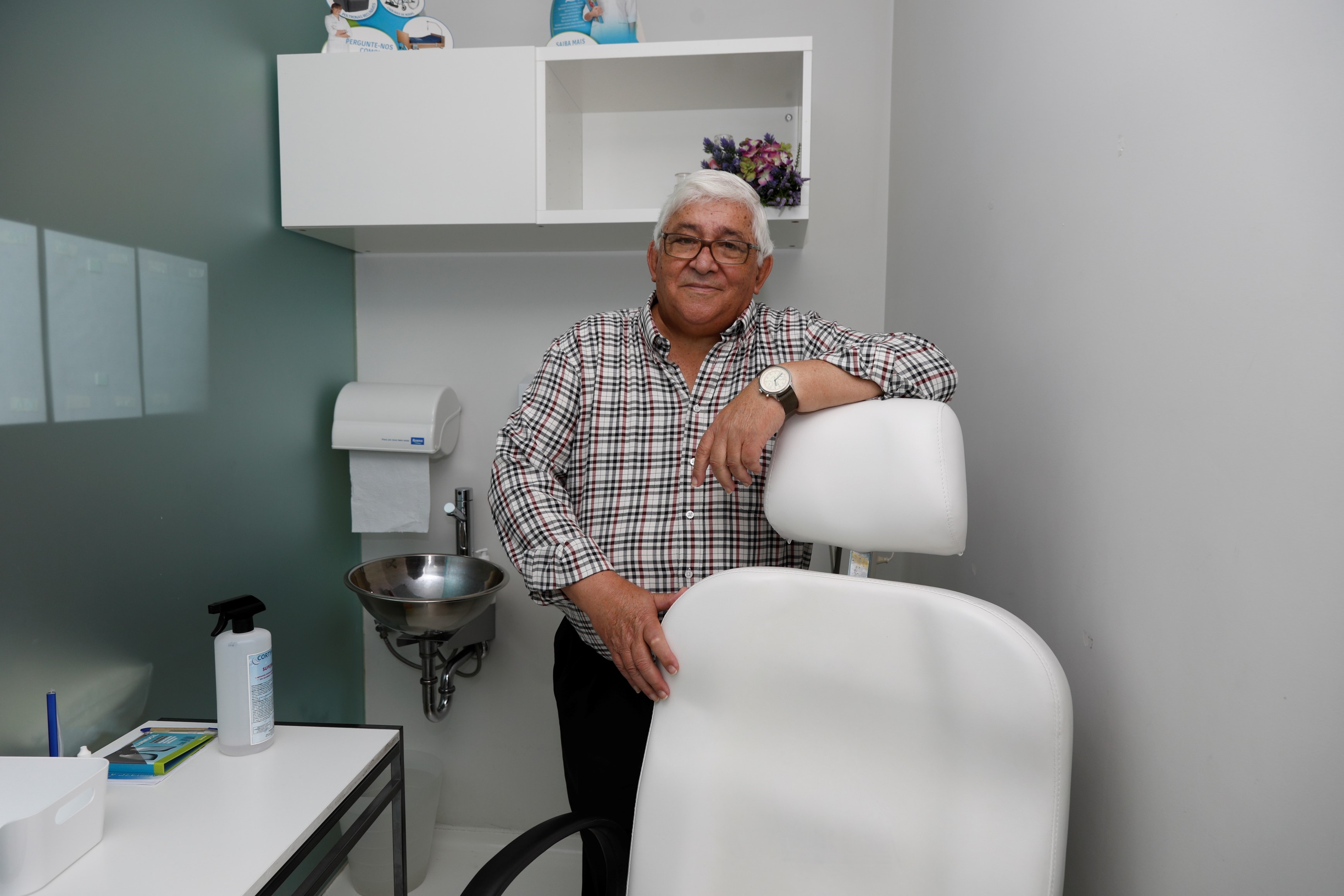 José Rosado, 75 anos, diabético e hipertenso, habituou-se a recorrer à farmácia quando tem problemas. «Há dias passei pelo centro de saúde e palavra de honra que havia uma fila de quase 200 pessoas», queixa-se. Faz aqui a consulta do pé diabético, o programa da hipertensão e todas as vacinas. Foi na farmácia que descobriu que estava infectado com o SARS-CoV-2. «A minha mulher fez um teste rápido aqui, deu positivo, e a doutora Isabel, preocupada, pediu logo que eu me viesse testar. Estava positivo também. Tive muito medo», relata o antigo operador de sistemas informáticos. Não houve «um dia sequer» em que a farmácia lhe faltasse com o telefonema a saber como estava. «Não há o que pague isto!», considera o septuagenário.