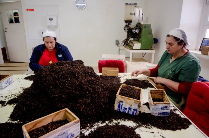 Na costa Norte da ilha, a terra enche-se de campos de plantas de chá, carreiros de arbustos verdes a perder de vista, com o mar por horizonte. O edifício branco com letras garrafais vermelhas anuncia: Chá Gorreana. É a mais antiga e única plantação de chá da Europa, a par da fábrica do Porto Formoso, mesmo ali ao lado. A fábrica de 1883 é um museu-vivo, que contém a história de um negócio familiar com seis gerações, onde as mulheres têm um papel predominante. Nasceu do fim do ciclo da laranja, encerrado por doenças que dizimaram as plantações. A então matriarca, Ermelinda Gago da Câmara, teve de refazer a vida. «A Gorreana foi um novo princípio», conta Madalena Mota, que pertence à sexta geração. «Não sabemos fazer mais nada».