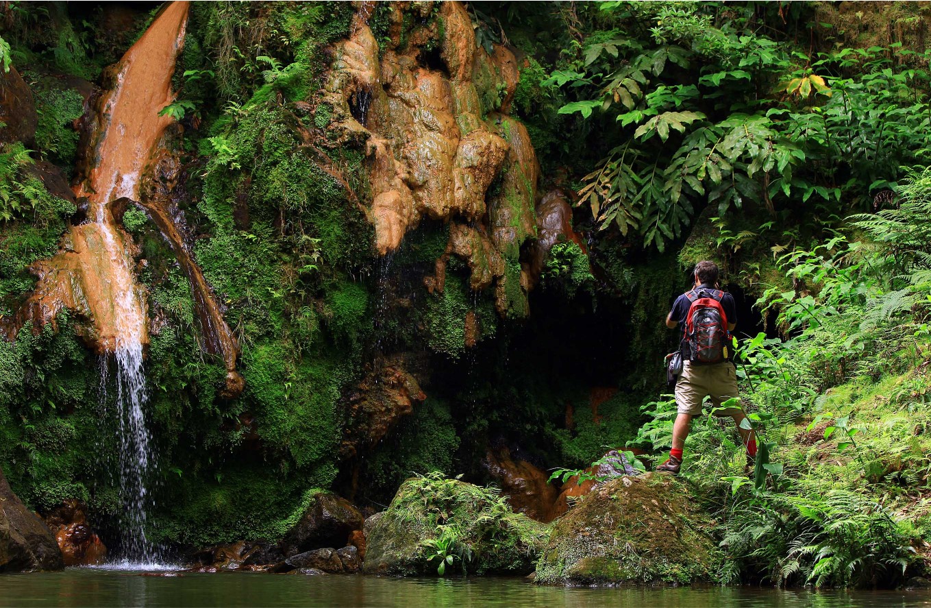 A entrada na Caldeira Velha faz-se por um trilho que corre entre árvores altíssimas, mistura de floresta nativa e exótica, até ao Centro de Interpretação Ambiental, onde se conta a história geológica de São Miguel. Ao contrário do que muitos pensam, a maioria dos vulcões da ilha está activa. Só os complexos vulcânicos do Nordeste e da Povoação, com 4,2 e 3,2 milhões de anos, respectivamente, estão extintos. Furnas e Sete Cidades, Fogo e a zona fissural dos Picos mantêm-se activos, conta o biólogo Tiago Meneses.