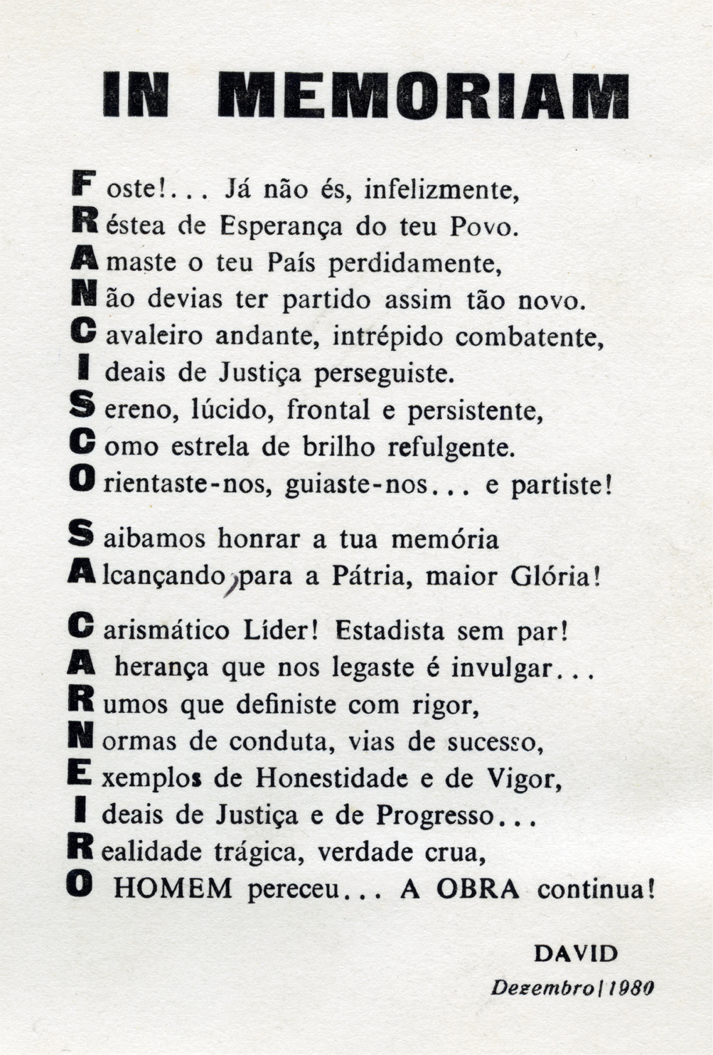 A tragédia de Francisco Sá Carneiro inspirou-lhe um poema acróstico, pleno de sentimento e de ideologia
