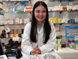 A estagiária especial ajuda a confirmar encomendas e coloca os medicamentos no saco dos utentes