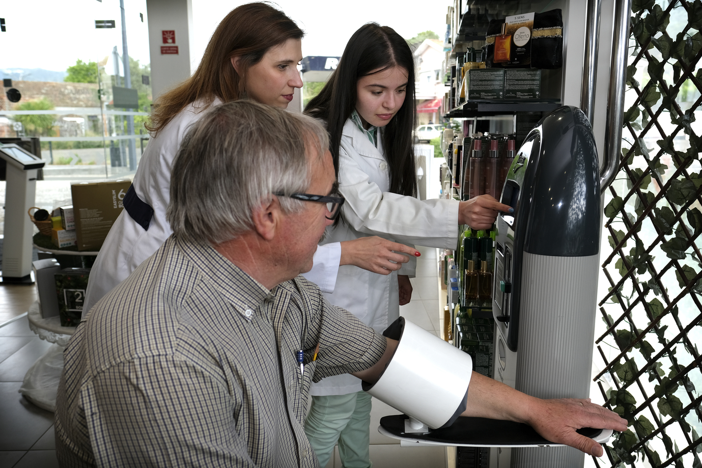 Esta tarde, o senhor Joaquim Dias veio à farmácia buscar medicamentos. Sentia-se mal, com tonturas, o que alarmou a farmacêutica Maria Miguel Correia, que decidiu medir-lhe a tensão arterial. Uma colaboradora, alegre e bastante jovem, acompanha-os pelo espaço amplo e moderno da farmácia.