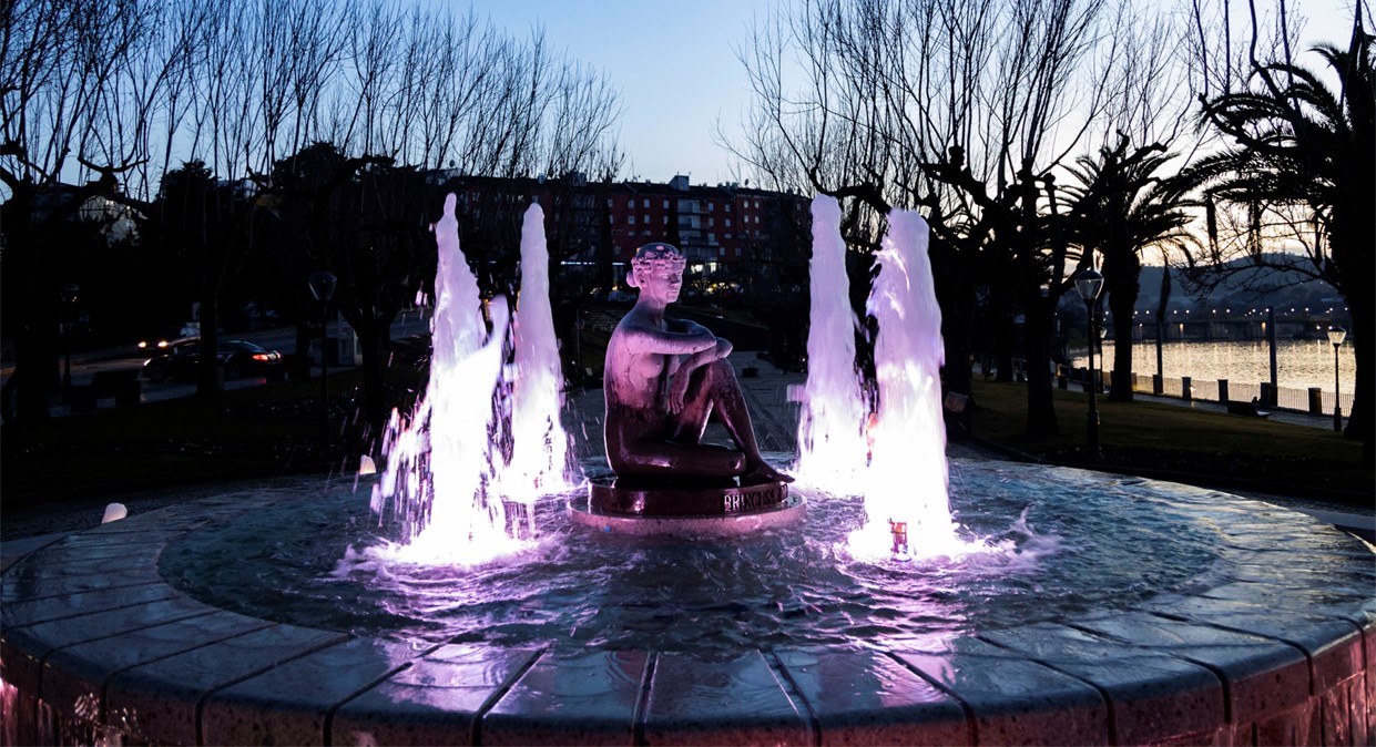 Quando o sol se põe, a fonte luminosa do Parque do Império ganha vida