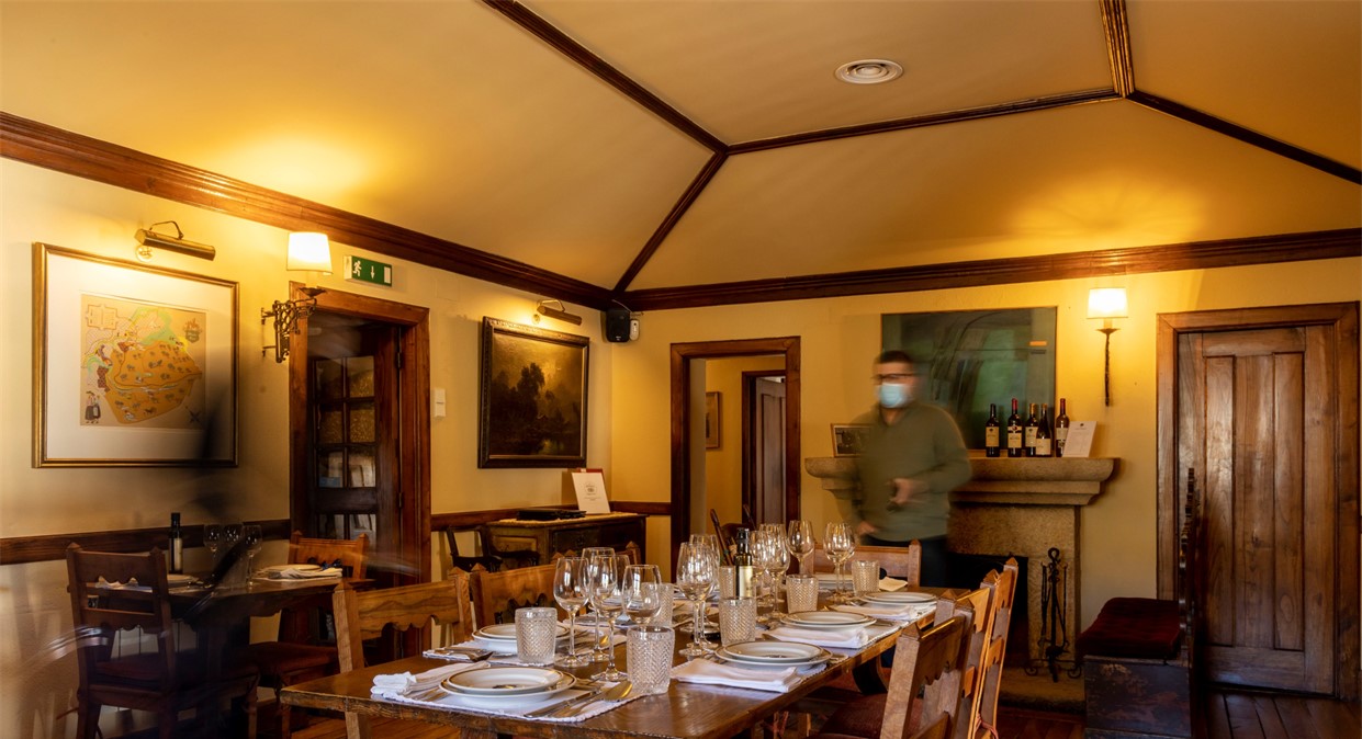 Nas salas grandiosamente decoradas de quadros, rústicas cadeiras de assentos aveludados e candeeiros dourados, as mesas postas aguardam a troca de conversas e petiscos. A lareira acesa, a reconfortar o espaço, faz lembrar os serões em família.