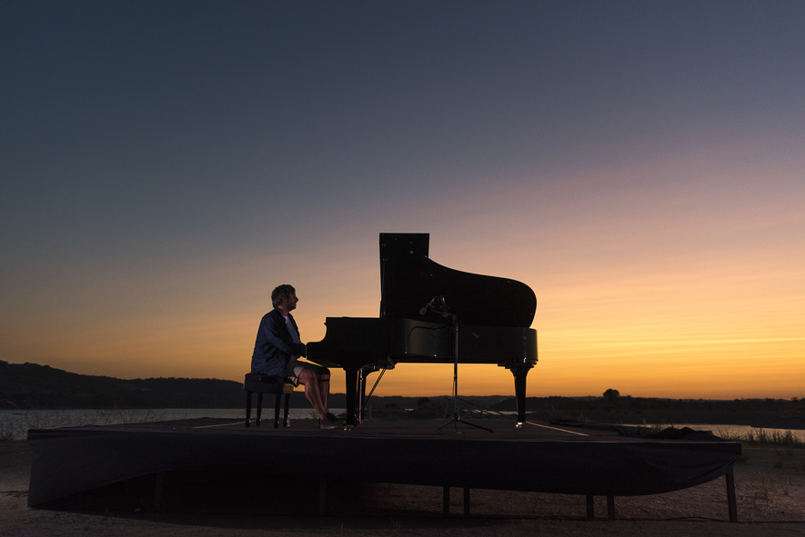De t-shirt e calções, o maestro senta-se ao piano e arranca uma improvisação, num cenário paradisíaco