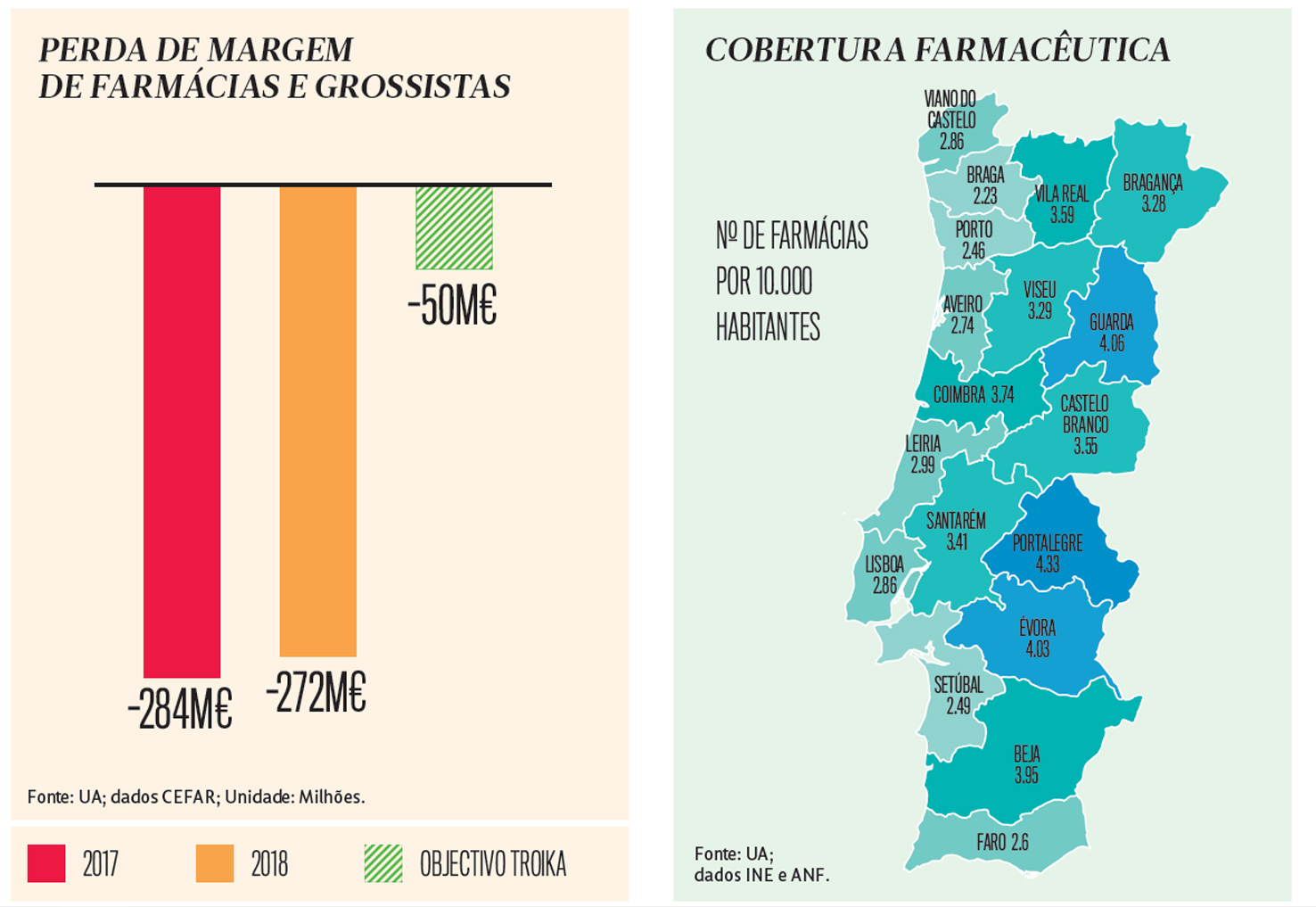 A rede de farmácias continua sob austeridade. «Do ponto de vista das farmácias, são ainda visíveis os efeitos negativos da crise económica e financeira, bem como do consequente programa de ajustamento imposto em Portugal», refere a UA nas conclusões. O corte na margem de farmácias e grossistas atingiu os 272M€ em 2018, cinco vezes superior ao preconizado pela Troika. Nos últimos dez anos, a despesa com medicamentos em ambulatório caiu 4,3%, o que coloca Portugal como o segundo país com maior quebra, logo a seguir à Grécia.