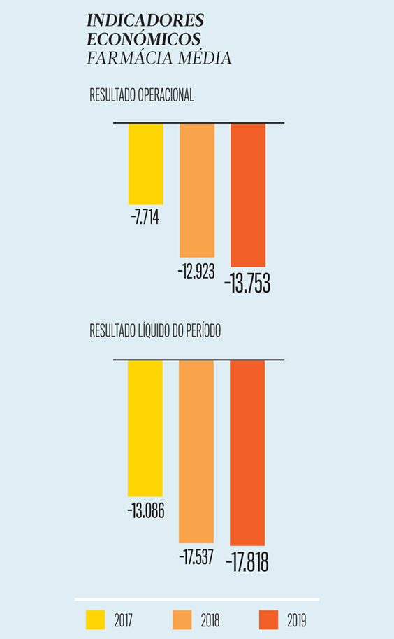 Entre 2017 e 2018, o resultado operacional da farmácia média sofreu uma redução abrupta de 67,5%. Este facto prejudicou de forma decisiva o resultado líquido, que se agravou de -12 923€ para -17.753€.