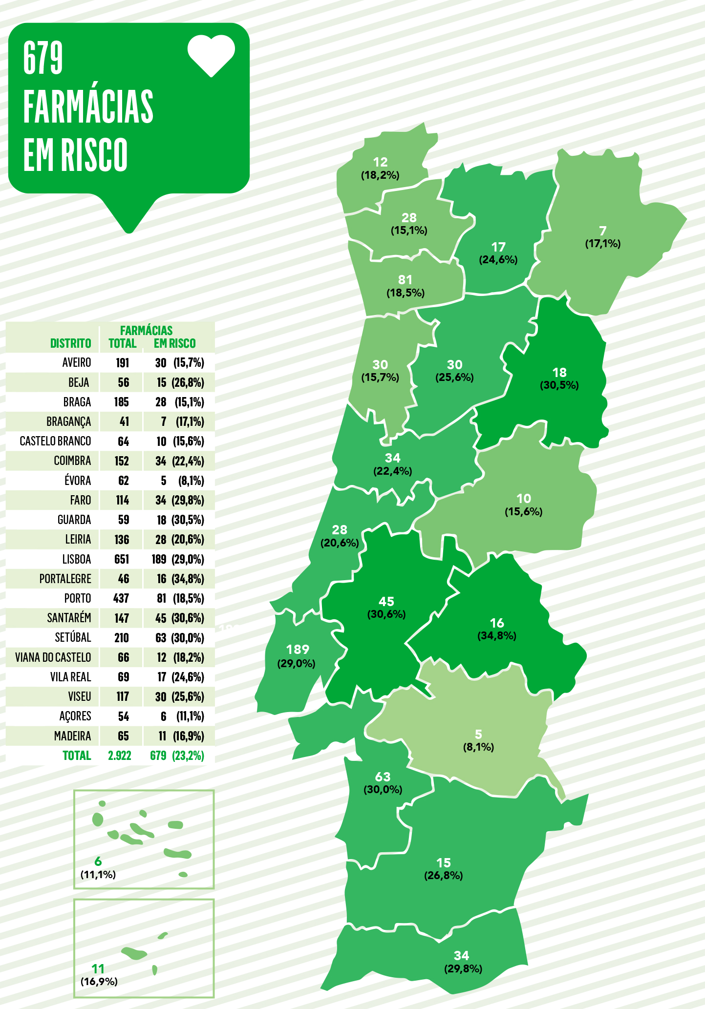 Neste momento, 679 farmácias enfrentam processos de penhora e insolvência, mais quatro do que no início do ano. «Ainda há uma farmácia próxima de cada português, mesmo nas terras onde fechou a extensão do centro de saúde, a escola, o tribunal e outros serviços públicos. É isso que está em risco», alerta a petição.