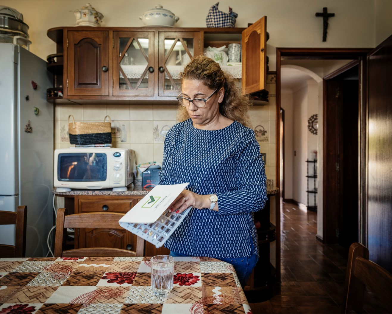 Os medicamentos já saem da farmácia organizados de acordo com a prescrição médica. Cada compartimento das caixinhas de plástico contém todas as cápsulas e os comprimidos para cada horário de medicação ao longo do dia. «Uma vez por semana vou à farmácia, trago o dispositivo e depois é só abrir o respectivo compartimento a cada refeição», explica Isaura.