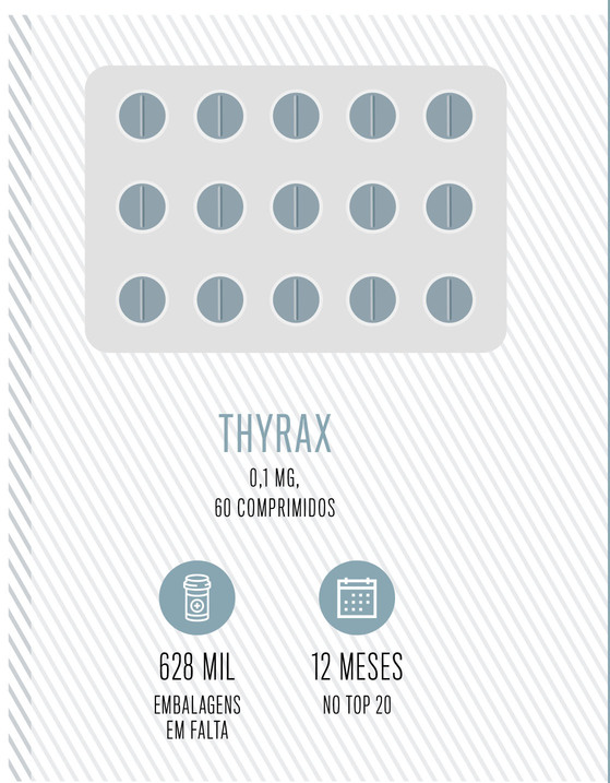 O Thyrax de 0,1 mg está «temporariamente indisponível» desde o início de Fevereiro de 2017, de acordo com informação disponibilizada pelo Infarmed. A dosagem de 0,025 mg também fez parte do top 20 de medicamentos em falta durante seis meses, com quase 331 mil embalagens reportadas. O Thyrax, medicamento com a substância activa levotiroxina sódica, pertence ao grupo farmacológico das hormonas da tiróide e antitiroideus. Embora haja alternativas, «não é recomendável fazer alterações entre as diferentes marcas de levotiroxina, devido às diferentes biodisponibilidades dos fármacos», afirma o endocrinologista Francisco Sobral Rosário.