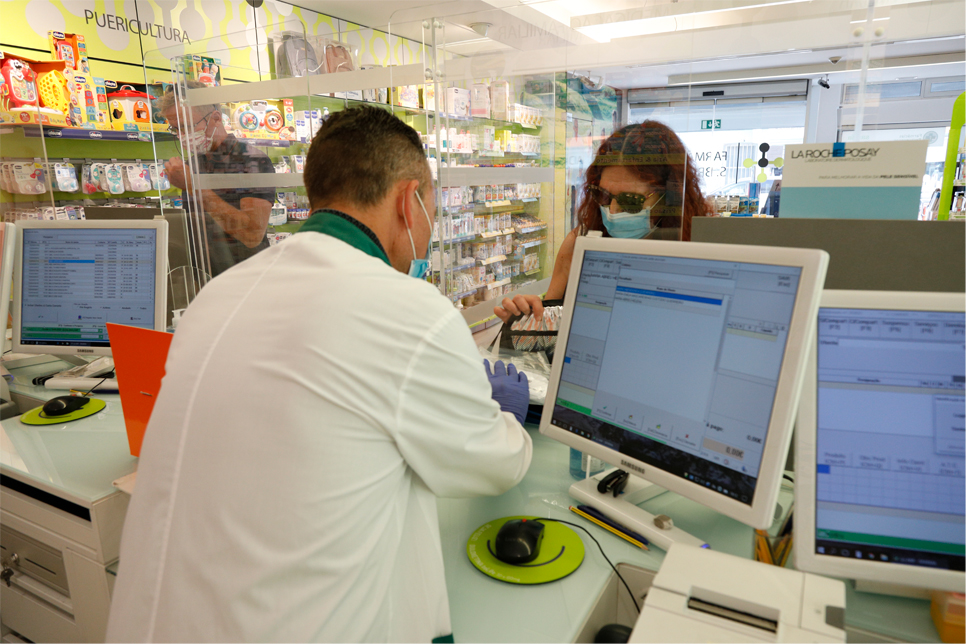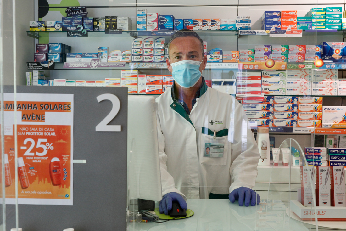 Jorge Santos comprou placas de acrílico para resguardar os seis balcões da farmácia e equipou os colaboradores com luvas e máscaras. Para proteger os utentes encontrou uma solução criativa: em menos de 24 horas conseguiu que uma carpintaria local montasse no interior da farmácia uma estrutura em madeira, com dois metros de altura, que individualiza o espaço onde os utentes são atendidos. «Era a única maneira de atendermos tantas pessoas ao mesmo tempo em segurança», explica o director-técnico, satisfeito porque as pessoas reagiram bem à inovação. Entretanto, instalou uma estrutura transparente, em acrílico, que «dilui a sensação de confinamento».