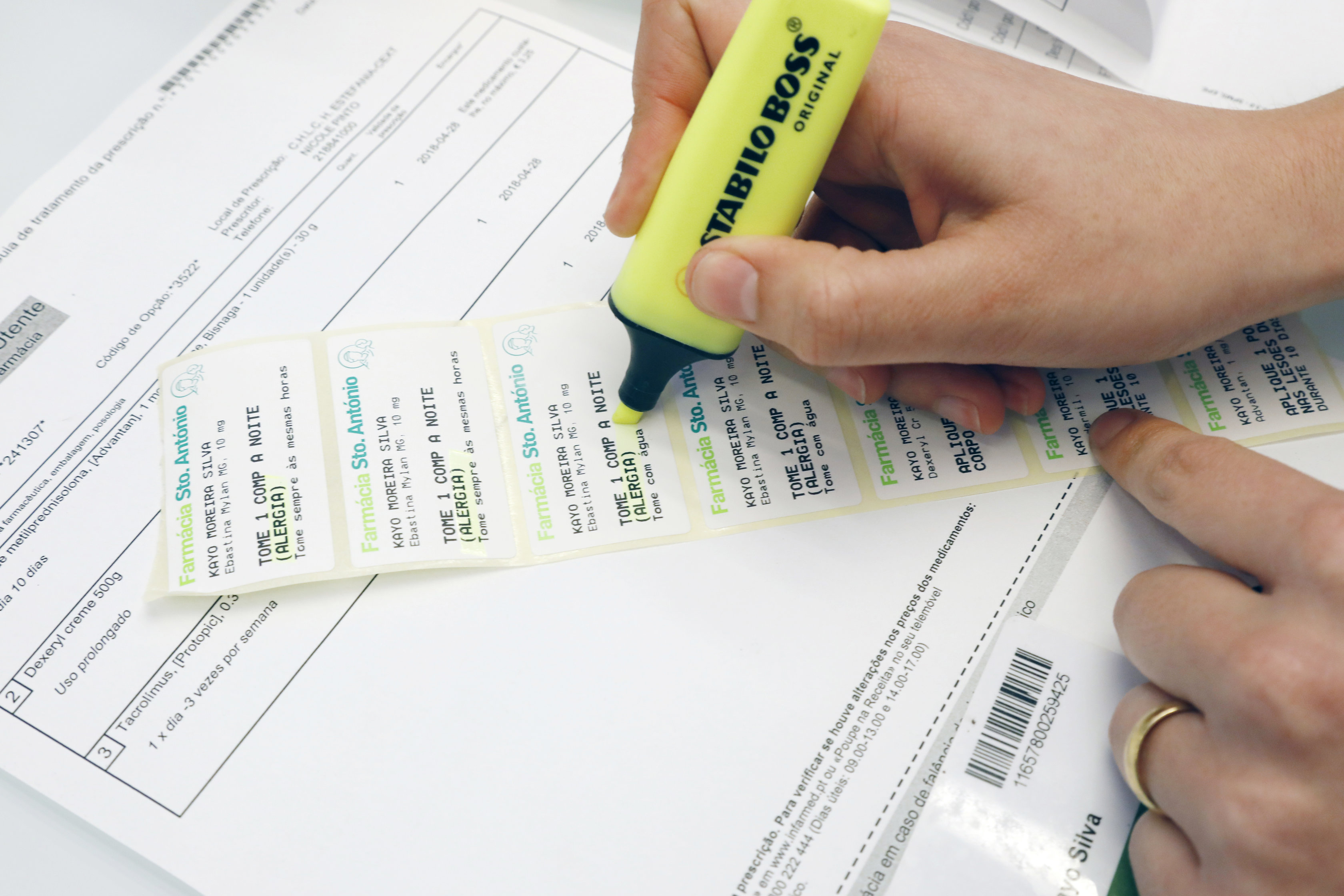 As etiquetas de posologia são personalizadas, o que evita riscos em lares de idosos e famílias numerosas