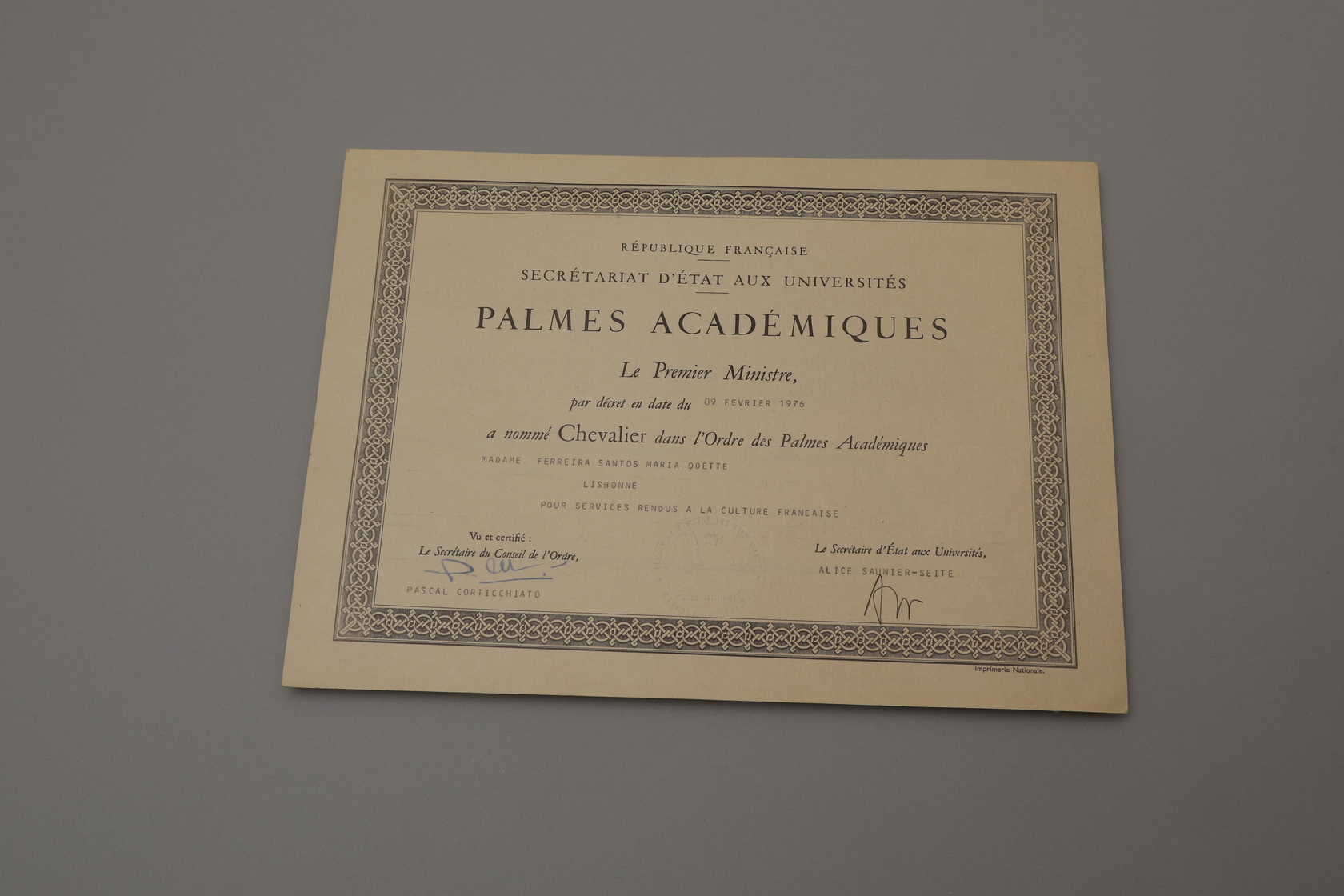 A condecoração de Odete Ferreira pelo Estado francês com o grau de cavaleira da Ordem das Palmas Académicas